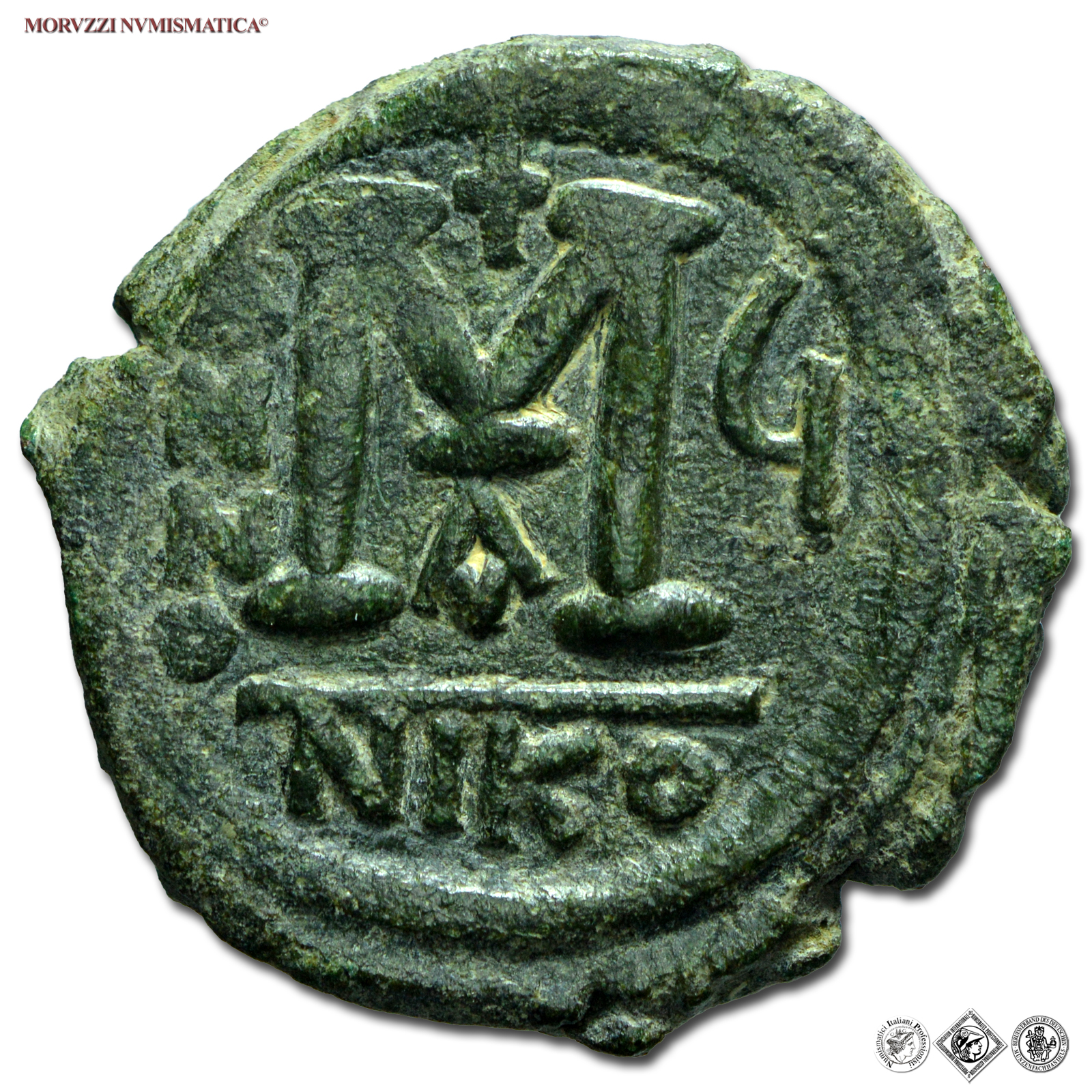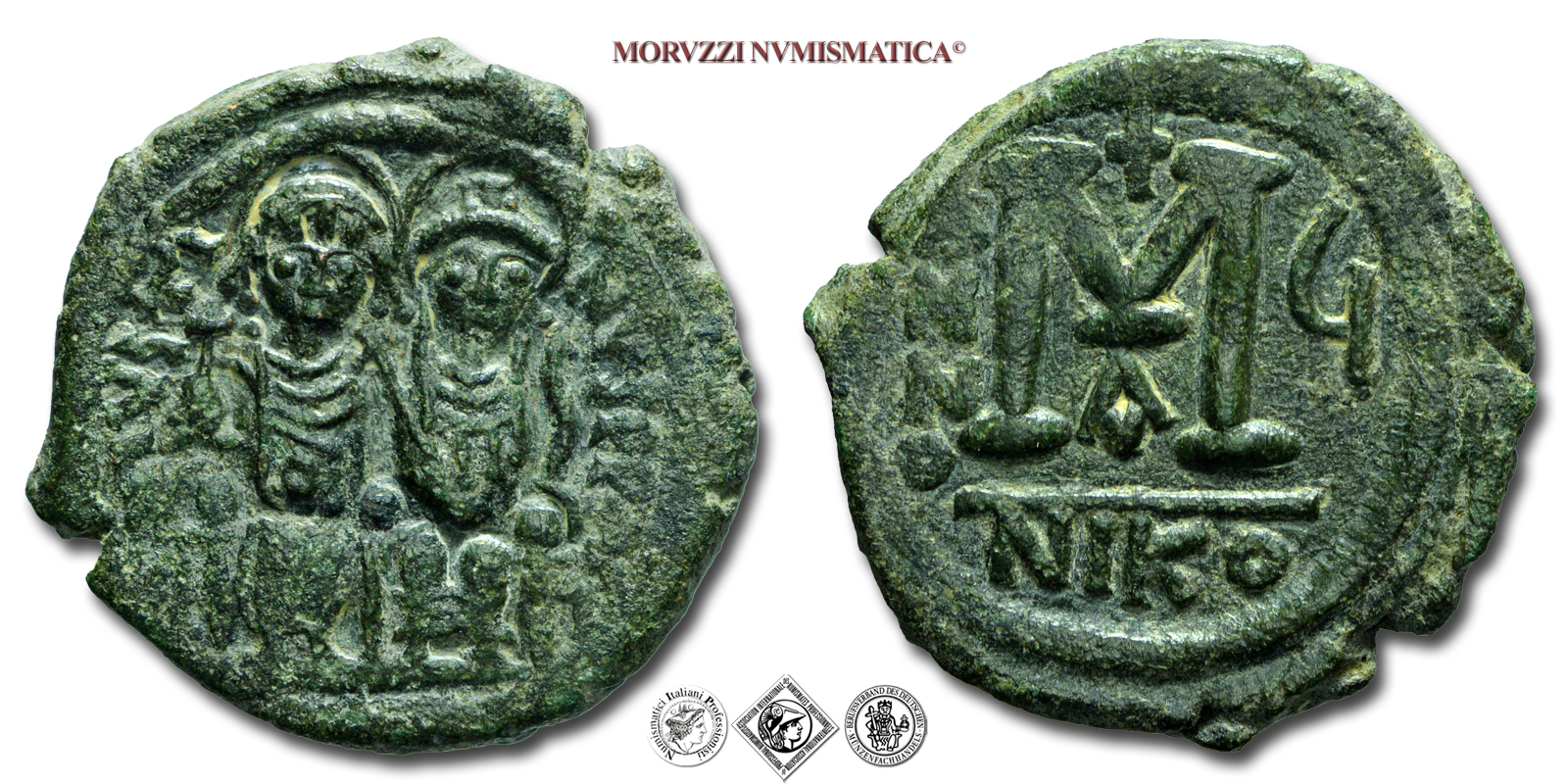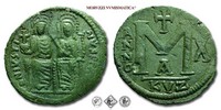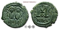 GIUSTINO II, FOLLIS, 565-578, D N IVSTINVS P P AVG Giustino e Sofia seduti di fronte / grande M tra ANNO Y, in alto croce, in basso A e in esergo NIKO, Zecca di Nicomedia, BRONZO, SPL, (Sear 369) / monete bizantine antiche (moneta dell'Impero Bizantino)