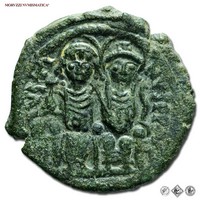 Impero Bizantino, GIUSTINO II, 565-578, FOLLIS, Emissione: 565-578, D/ D N IVSTINVS P P AVG, Giustino e Sofia seduti di fronte, entrambi nimbati, lui tiene il globo crucigero, lei lo scettro cruciforme, R/ grande M tra ANNO Y, in alto croce, in basso A e in esergo NIKO, Zecca di Nicomedia, Rif. bibl. Sear, 369; DOB, 92-103; Metallo: AE, gr. 11,47, (MB17955), Diam.: mm. 28,86, SPL