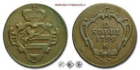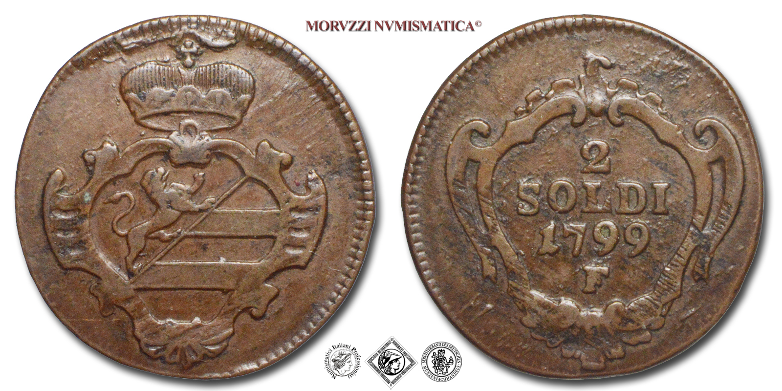 Gorizia, FRANCESCO II D'ASBURGO, 1797-1805, SOLDI 2, Emissione: 1799 F, D/ Stemma di Gorizia con Leone rampante su sbarrato all'interno di un ornato sormontato da una corona, R/ Indicazione del valore (2 SOLDI) e millesimo (1799) su tre righe all'interno di un ornato. Sotto il millesimo l'eventuale segno di zecca (F), Zecca di Hall, Rif. bibl. Pagani, 277; Metallo: CU, gr. 5,30, (MZ73689), Diam.: mm. 22,77, qSPL, (R)