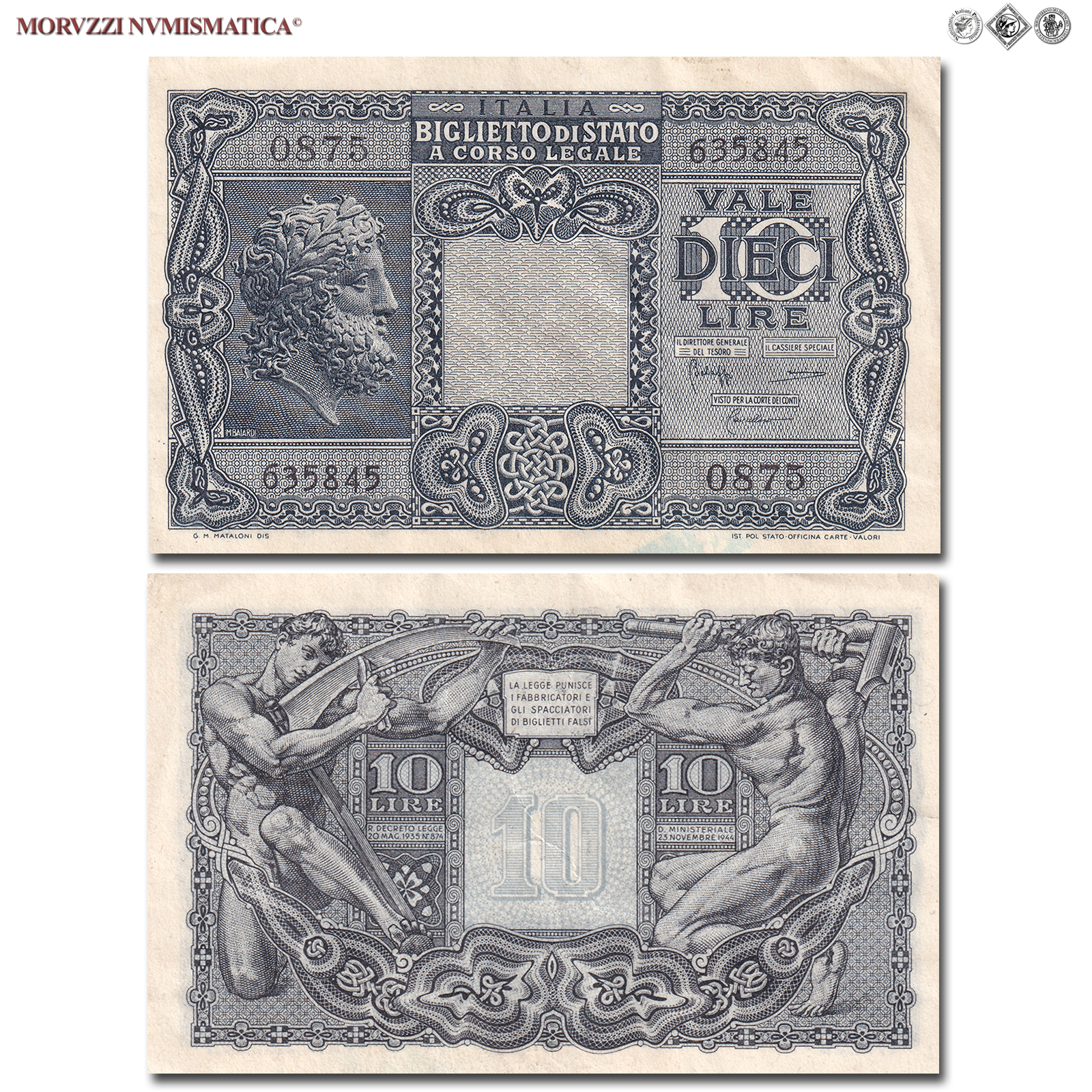 Italia, Luogotenenza, BIGLIETTO DI STATO, LIRE 10, Giove23.11.1944, D/ Testa di Giove a sinistra, R/ Rappresentazione del Lavoro, con due figure allegoriche con falce e martello, Rif. bibl. Crapanzano, BS49; (CM154477), Firme: Bolaffi, Cavallaro, Giovinco, di serie: 0875 635845, mSPL