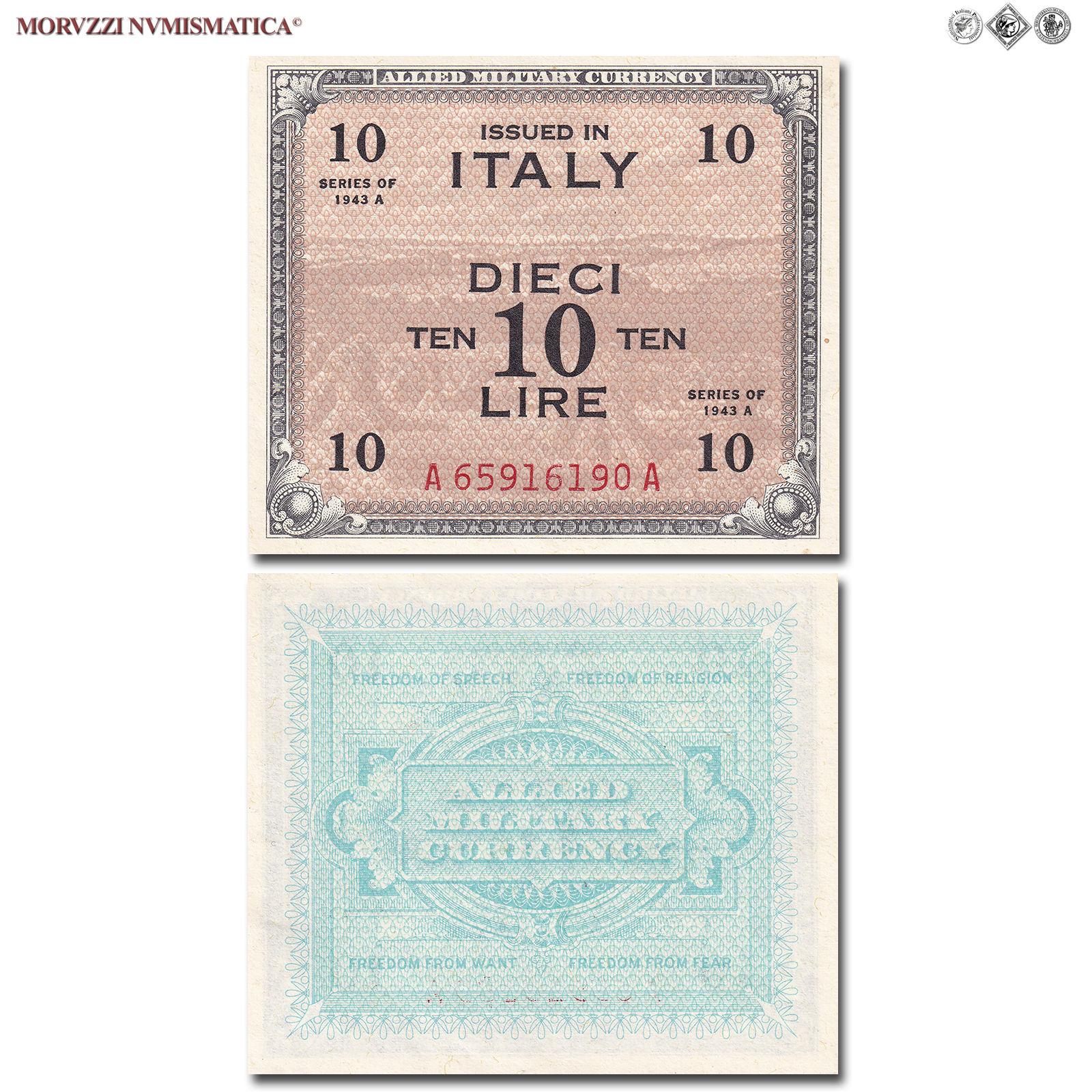 Italia, Occupazione Americana, ALLIED MILITARY CURRENCY, AM LIRE 10, Bilingue, Tipografia: FLC (Forbes Lithograph Corporation), 1943 A, D/ Sullo sfondo paesaggio agricolo con covoni di grano e contorno nero; scritta "DIECI LIRE - TEN TEN" al centro e cifra "10" sui quattro angoli, R/ Al centro scritta "ALLIED MILITARY CURRENCY" e tutto intorno le quattro libertà costituzionali statunitensi: "Freedom of Speech - Freedom of Religion - Freedom from Want - Freedom from Fear", Rif. bibl. Crapanzano, OS57A; (CM133289), Firme: FLC, di serie: A 65916190 A, FDS