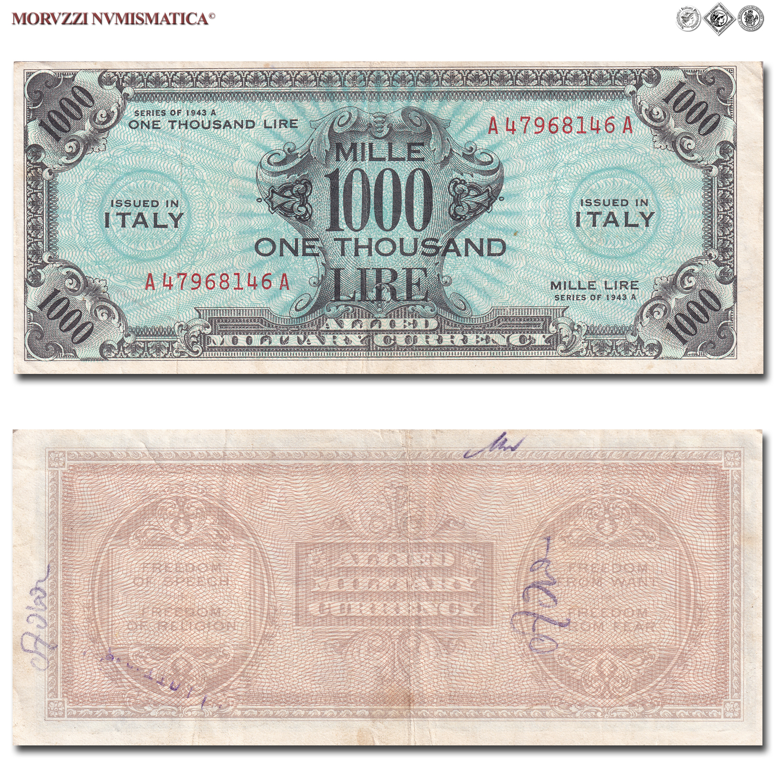 Italia, Occupazione Americana, ALLIED MILITARY CURRENCY, AM-LIRE 1000, Bilingue,Tipografia: FLC (Forbes Lithograph Corporation), 1943 A, D/ scritta "MILLE LIRE - ONE THOUSAND" al centro e cifra "1000" sui quattro angoli; contorno grigio, R/ Al centro scritta "ALLIED MILITARY CURRENCY" e tutto intorno le quattro libertà costituzionali statunitensi: "Freedom of Speech - Freedom of Religion - Freedom from Want - Freedom from Fear", Rif. bibl. Crapanzano, OS65; (CM113748), di serie: A 47968146 A, BB, (R)