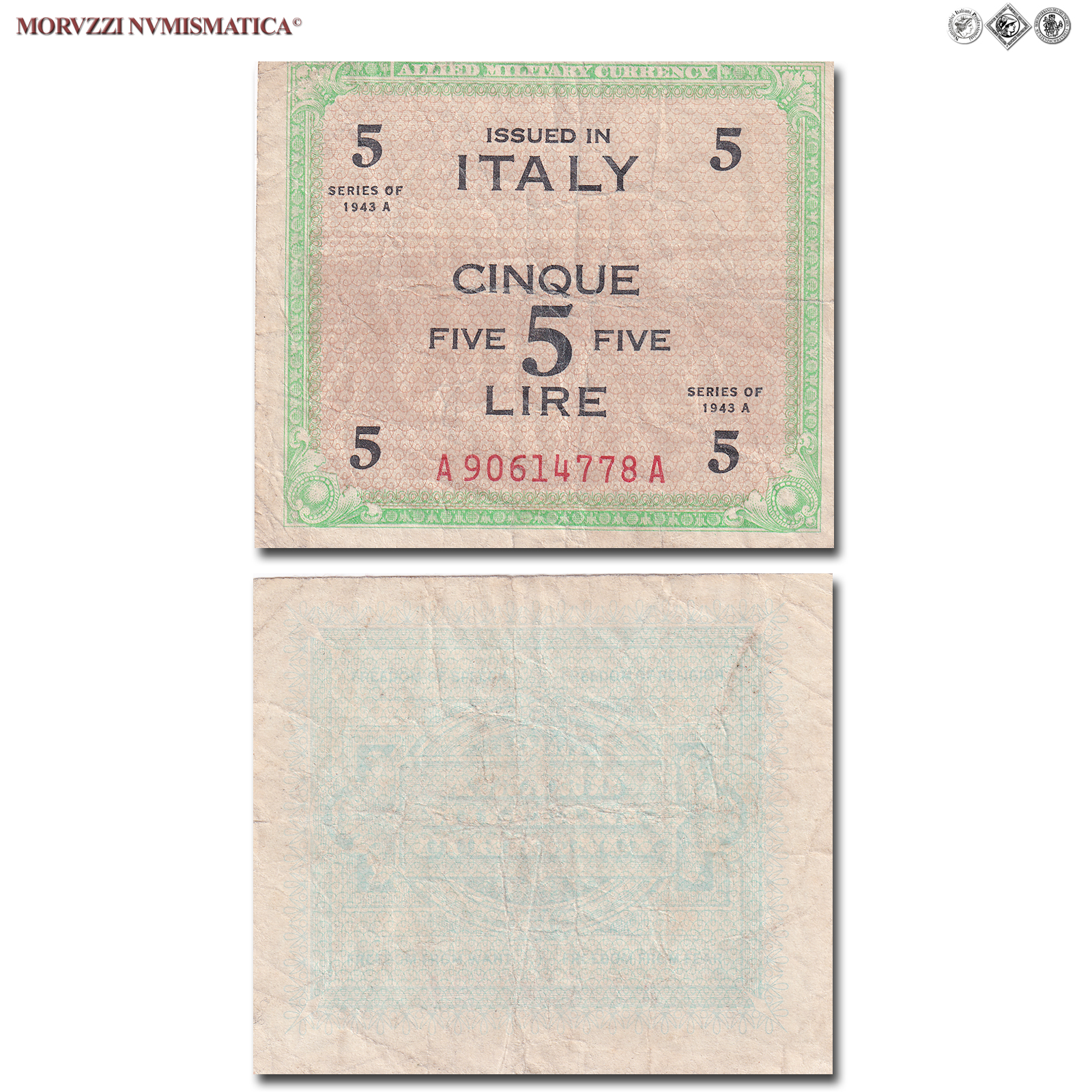 Italia, Occupazione Americana, ALLIED MILITARY CURRENCY, AM-LIRE 5, 1943 A, Bilingue, Tipografia: FLC (Forbes Lithograph Corporation), BB, (Crapanzano OS55A) / banconote italiane (cartamoneta italiana - banconota da collezione)