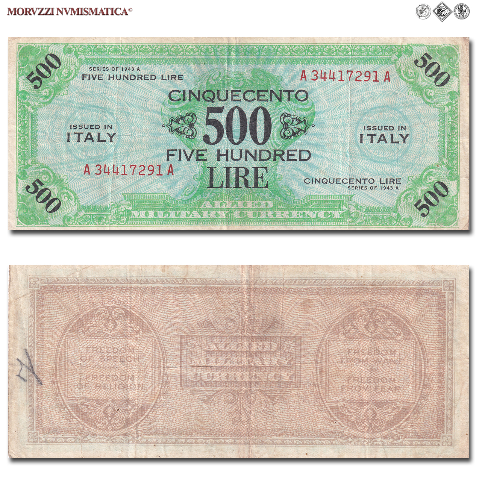 Italia, Occupazione Americana, ALLIED MILITARY CURRENCY, AM LIRE 500, Bilingue,Tipografia: FLC (Forbes Lithograph Corporation), 1943 A, D/ scritta "CINQUECENTO LIRE - FIVE HUNDRED" al centro e cifra "500" sui quattro angoli; contorno verde, R/ Al centro scritta "ALLIED MILITARY CURRENCY" e tutto intorno le quattro libertà costituzionali statunitensi: "Freedom of Speech - Freedom of Religion - Freedom from Want - Freedom from Fear", Rif. bibl. Crapanzano, OS63; (CM105161), Firme: FLC, di serie: A 34417291 A, BB, (R)