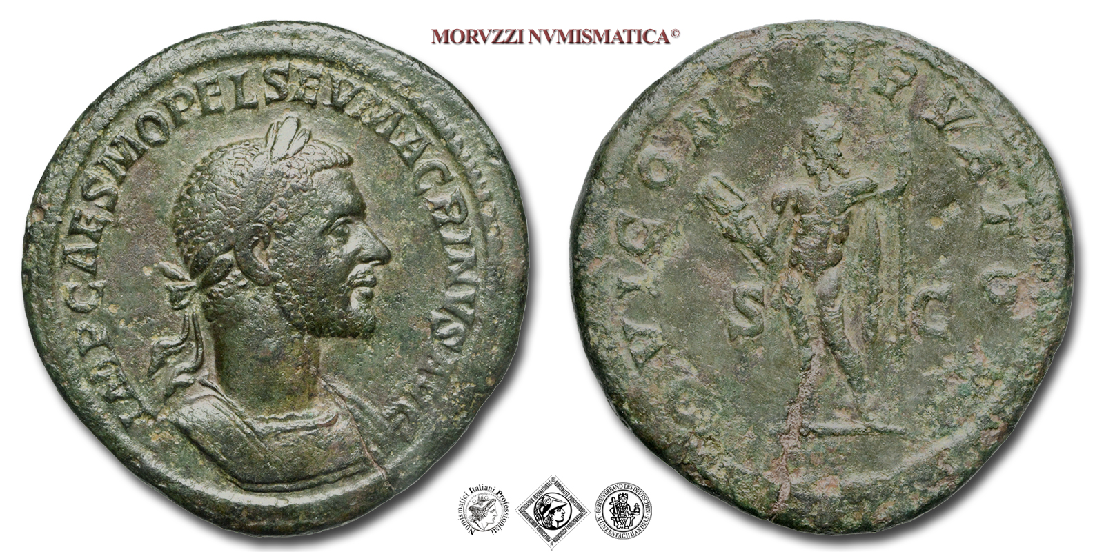 Impero Romano, MACRINO, 217-218 d.C., SESTERZIO, Emissione: 217-218 d.C., D/ IMP CAES M OPEL SEV MACRINVS AVG, busto laureato con corazza a d., R/ IOVI CONSERVATORI, S C, Giove stante a sinistra con fulmine nella destra e scettro nella sinistra, Zecca di Roma, Rif. bibl. R.I.C., 185/S; Cohen, 34; Metallo: AE, gr. 28,78, (MR161114), Diam.: mm. 33,61, mBB, (R)
