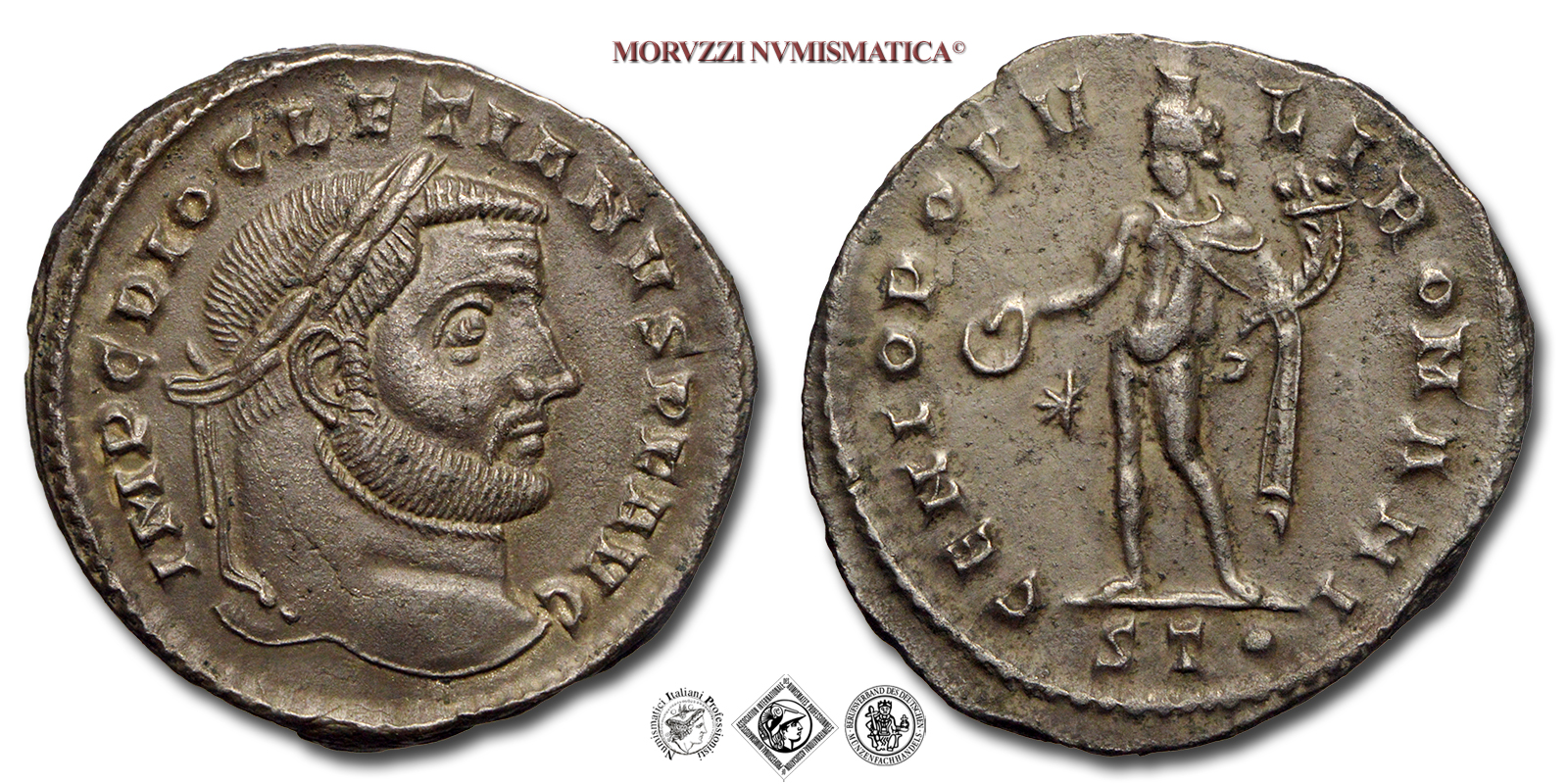 MASSIMIANO ERCULEO, FOLLIS, 296-297 d.C., GENIO POPVLI ROMANI / S T • il Genio con il modius sul capo ed il mantello sulla spalla sinistra tiene una patera ed una cornucopia; nel campo, a s.: una stella, Zecca di Ticinum, BRONZO, SPL, (RIC 33b) / monete romane imperiali antiche (moneta romana imperiale antica della Tetrarchia - Impero Romano)