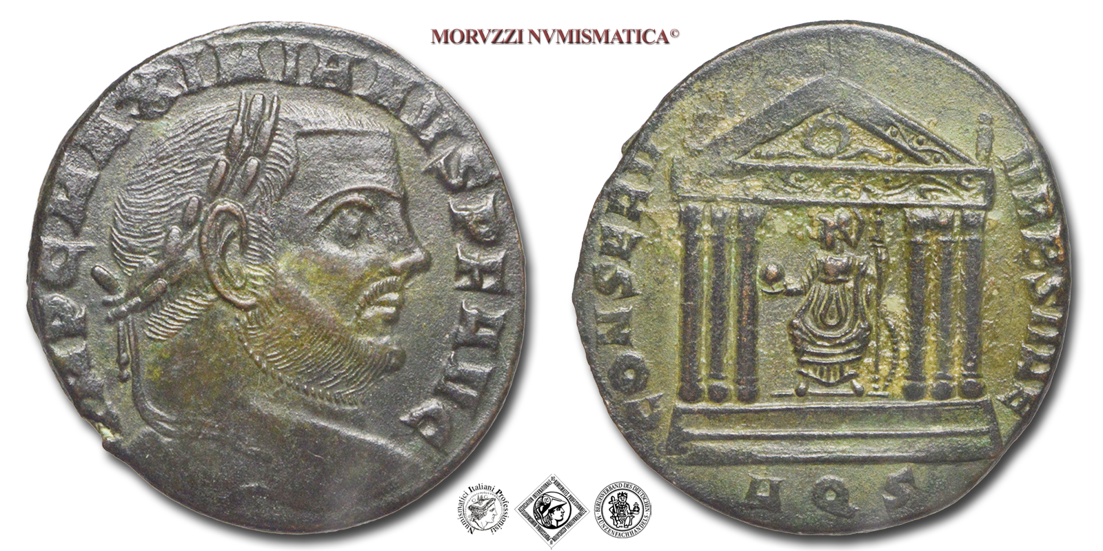 Impero Romano, MASSIMIANO ERCULEO, 286-310 d.C., FOLLIS, Emissione: 307-309/310 d.C., D/ IMP C MAXIMIANVS P F AVG, testa laureata a destra, R/ CONSERV VRB SVAE, AQS, Roma galeata seduta in un tempio esastilo. Nel frontone una semiluna, Zecca di Aquileia, Rif. bibl. R.I.C., 121b/S; Cohen, 64; Metallo: AE, gr. 7,05, (MR160294), Diam.: mm. 22,98, mBB, (R)