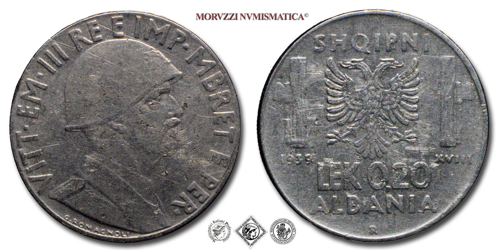 Regno d'Italia, Albania, VITTORIO EMANUELE III, 1939-1943, LEK 0,20, Antimagnetica, Emissione: 1939 A XVIII, D/ Aquila bicipite albanese contornata da due fasci con le scuri verso l'esterno. Sotto il fascio di sinistra, il millesimo (1939), sotto quello di destra, l'anno dell'Era Fascista (XVIII). In alto SHQIPNI, sotto, indicazione del valore (LEK 0,20) e ALBANIA su due righe. A ore 6 il segno di zecca (R), R/ VITT • EM • III RE E IMP • MBRET E PER •, semibusto in uniforme ed elmato del Re volto a destra. Sotto il collo del Re, lungo il bordo, il nome dell'autore (G. ROMAGNOLI), Zecca di Roma, Rif. bibl. Pagani, 1002; Metallo: AC, gr. 4,06, (MI121679), Diam.: mm. 21,78, BB