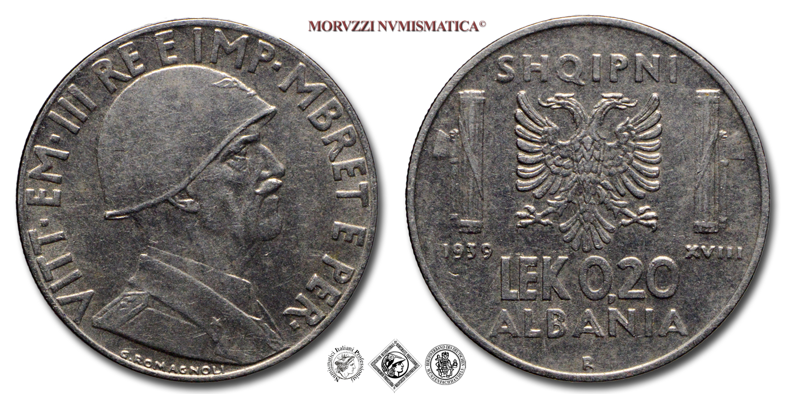 Regno d'Italia, Albania, VITTORIO EMANUELE III, 1939-1943, LEK 0,20, Antimagnetica, Emissione: 1939 A XVIII, D/ Aquila bicipite albanese contornata da due fasci con le scuri verso l'esterno. Sotto il fascio di sinistra, il millesimo (1939), sotto quello di destra, l'anno dell'Era Fascista (XVIII). In alto SHQIPNI, sotto, indicazione del valore (LEK 0,20) e ALBANIA su due righe. A ore 6 il segno di zecca (R), R/ VITT • EM • III RE E IMP • MBRET E PER •, semibusto in uniforme ed elmato del Re volto a destra. Sotto il collo del Re, lungo il bordo, il nome dell'autore (G. ROMAGNOLI), Zecca di Roma, Rif. bibl. Pagani, 1002; Metallo: AC, gr. 4,28, (MI121677), Diam.: mm. 21,70, SPL