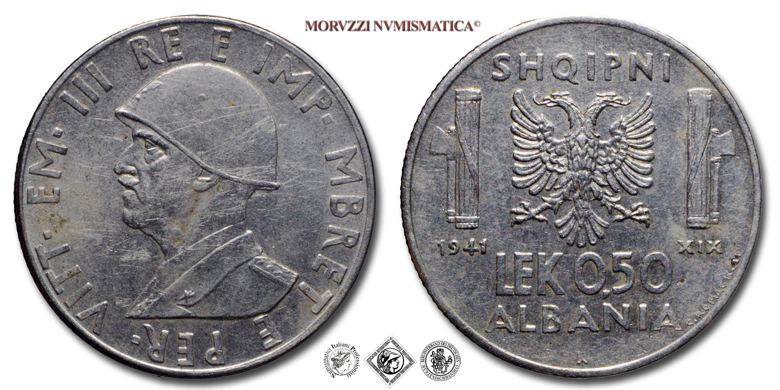 Regno d'Italia, Albania, VITTORIO EMANUELE III, 1939-1943, LEK 0,50, Emissione: 1941 XIX, D/ VITT • EM • III RE E IMP • MBRET E PER •, semibusto in uniforme ed elmato del Re volto a s., R/ aquila bicipite albanese contornata da due fasci con le scuri verso l'esterno; sotto il fascio di s.: il millesimo (1941); sotto quello di d.: l'anno dell'Era Fascista (XIX); in alto: SHQIPNI; sotto, su due righe: indicazione del valore (LEK 0,50) e ALBANIA; a ore 6, lungo il bordo: il segno di zecca (R); da ore 4 a ore 5, lungo il bordo: indicazione dell'autore (G. ROMAGNOLI), Zecca di Roma, Rif. bibl. Pagani, 1001; Metallo: AC, gr. 6,03, (MI121676), Diam.: mm. 24,07, qSPL