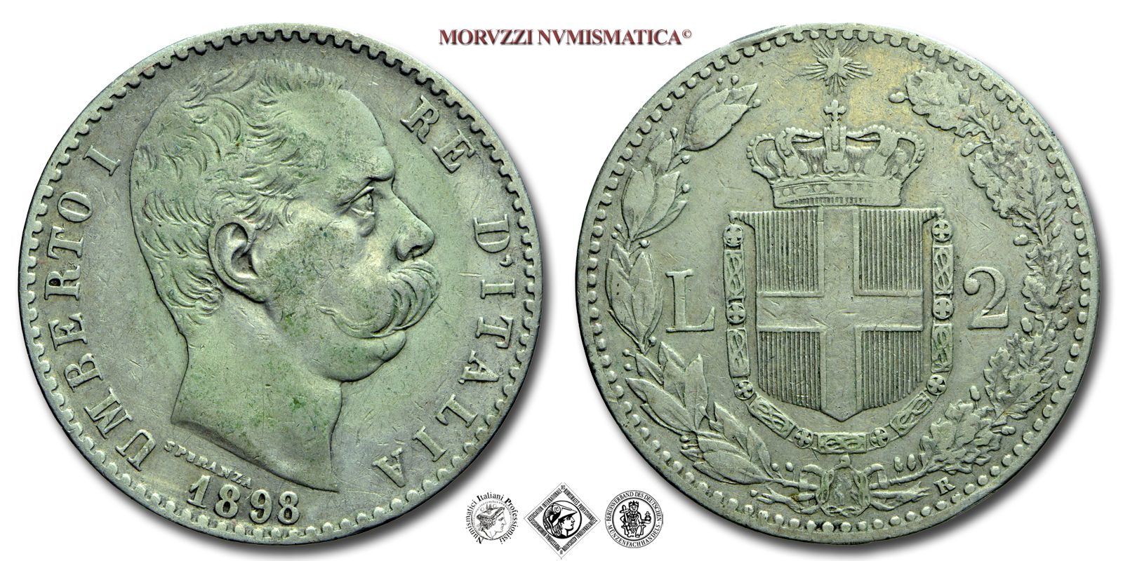 Regno d'Italia, UMBERTO I, 1878-1900, 2 LIRE, Emissione: 1898, D/ UMBERTO I RE D'ITALIA, testa nuda del Re a d.; sotto il collo del Re il nome dell'autore (SPERANZA); in basso: il millesimo (1898), R/ stemma Sabaudo contornato da rami di alloro e dal valore (L 2); in basso, a ore cinque, il segno di zecca (R); in alto la Stella d'Italia, Zecca di Roma, Rif. bibl. Pagani, 599; Metallo: AR, gr. 9,90, (MI148378), Diam.: mm. 27,03, mBB, (R)