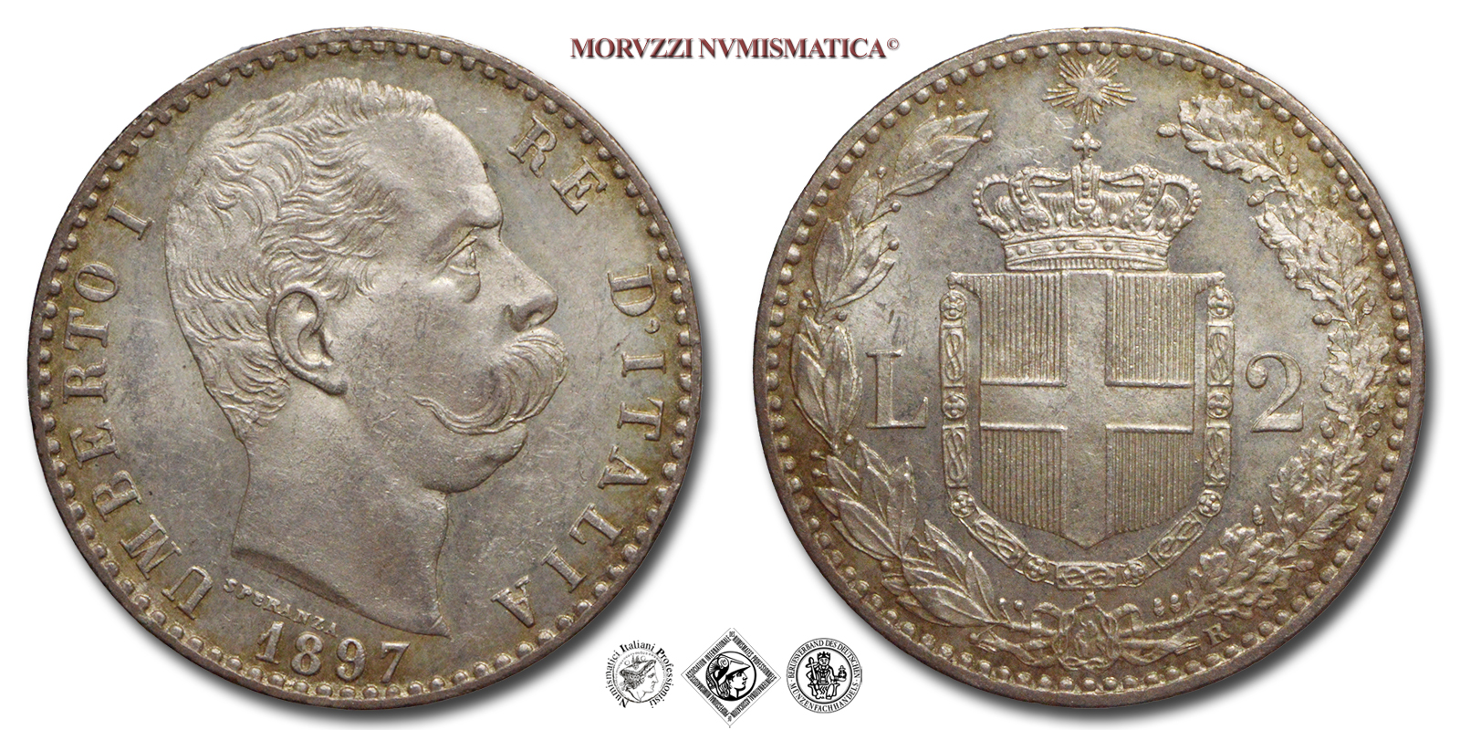 Regno d'Italia, UMBERTO I, 1878-1900, LIRE 2, Emissione: 1897, D/ UMBERTO I RE D'ITALIA, testa nuda del Re a d.; sotto al collo del Re il nome dell'autore (SPERANZA); in basso: il millesimo (1897), R/ Stemma Sabaudo contornato da rami di alloro e dal valore (L • 2). In basso a ore 5 il segno di zecca (R). In alto la stella d'Italia, Zecca di Roma, Rif. bibl. Pagani, 598; Metallo: AR, gr. 10,01, (MI150344), Diam.: mm. 27,10, FDC