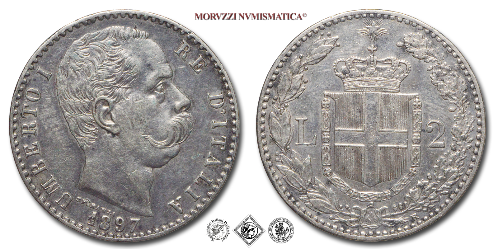 Regno d'Italia, UMBERTO I, 1878-1900, LIRE 2, Emissione: 1897, D/ UMBERTO I RE D'ITALIA, testa nuda del Re a d.; sotto al collo del Re il nome dell'autore (SPERANZA); in basso: il millesimo (1897), R/ Stemma Sabaudo contornato da rami di alloro e dal valore (L • 2). In basso a ore 5 il segno di zecca (R). In alto la stella d'Italia, Zecca di Roma, Rif. bibl. Pagani, 598; Metallo: AR, gr. 9,99, (MI155601), Diam.: mm. 27,02, mBB