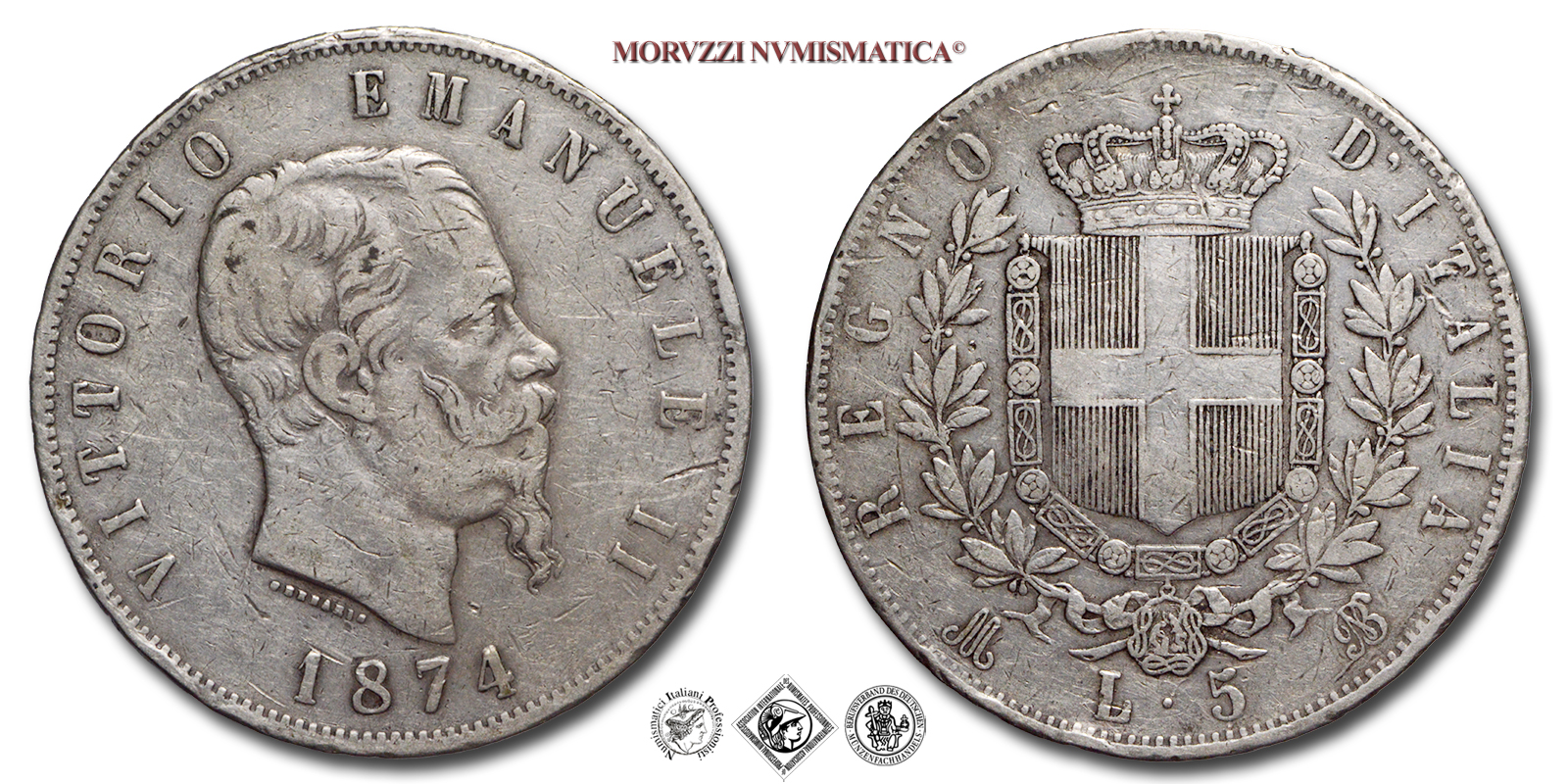 Regno d'Italia, VITTORIO EMANUELE II, 1861-1878, LIRE 5, Emissione: 1874 M, D/ VITTORIO EMANUELE II, testa nuda del Re a d.; lungo il taglio del collo il nome dell'incisore FERRARIS; sotto il millesimo (1874), R/ Stemma del casato Savoia con il collare dell'Annunziata sormontato da corona Reale e circondato da due rami di lauro; sotto: il segno di zecca (M), il valore nominale (L • 5) e il monogramma (BN), Zecca di Milano, Rif. bibl. Pagani, 498; Metallo: AR, gr. 24,85, (MI107647), Diam.: mm. 37,20, MB
