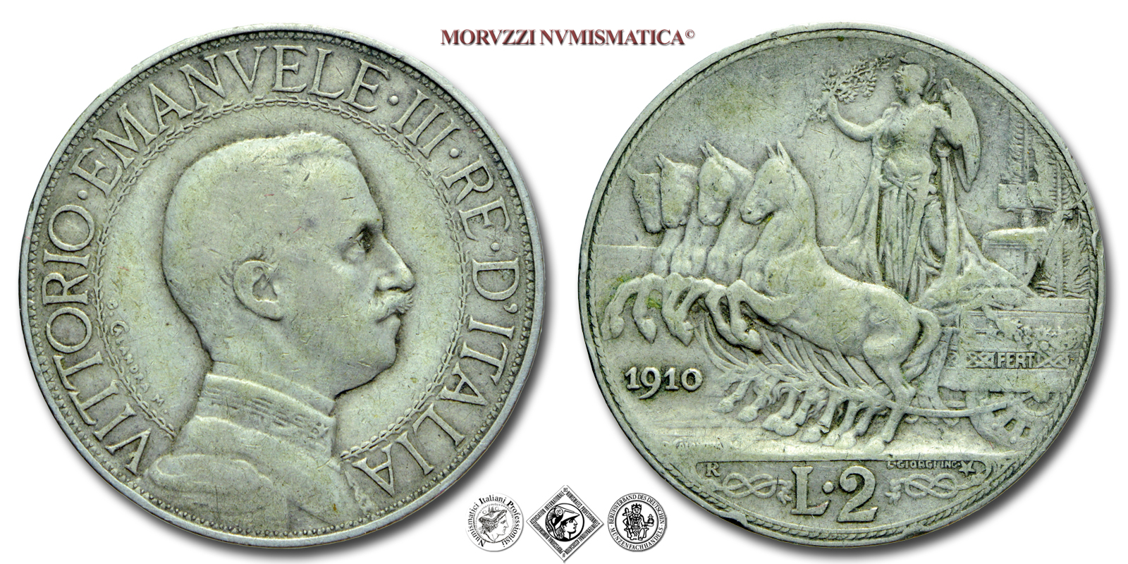 Regno d'Italia, VITTORIO EMANUELE III, 2 LIRE, 1910, Quadriga veloce, Zecca di Roma, ARGENTO, BB, (R), (Pagani 733) / monete italiane moderne rare d'argento (moneta italiana moderna rara da collezione - Casa Savoia)