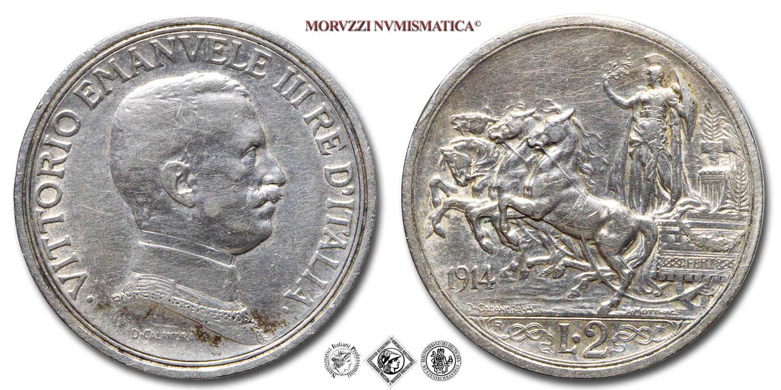 Regno d'Italia, VITTORIO EMANUELE III, 1900-12943, LIRE 2, Quadriga briosa, Emissione: 1914, D/ • VITTORIO • EMANUELE • III • RE • D'ITALIA •, busto in uniforme e con il collare dell'Annunziata del Re a d.; sotto: indicazione del nome dell'autore (D • CALANDRA •), R/ figura allegorica dell'Italia con scudo, elmo e ramo di quercia posta su di un carro trainato da quattro cavalli. Il carro è adorno di festoni, di nodi savoia e presenta il motto FERT; sotto le zampe anteriori dei cavalli: indicazione del millesimo (1914) ; in esergo: indicazione del nominale (L • 2) tra due nodi savoia; sopra il nodo di s.: il segno di zecca (R); sopra il nodo di d.: una stella a cinque punte; sulla linea dell'esergo: a s. il nome dell'autore (D • CALANDRA • M), a d. il nome dell'incisore (A • MOTTI INC •), Zecca di Roma, Rif. bibl. Pagani, 737; Metallo: AR, gr. 9,98, (MI159602), Diam.: mm. 27,07, BB