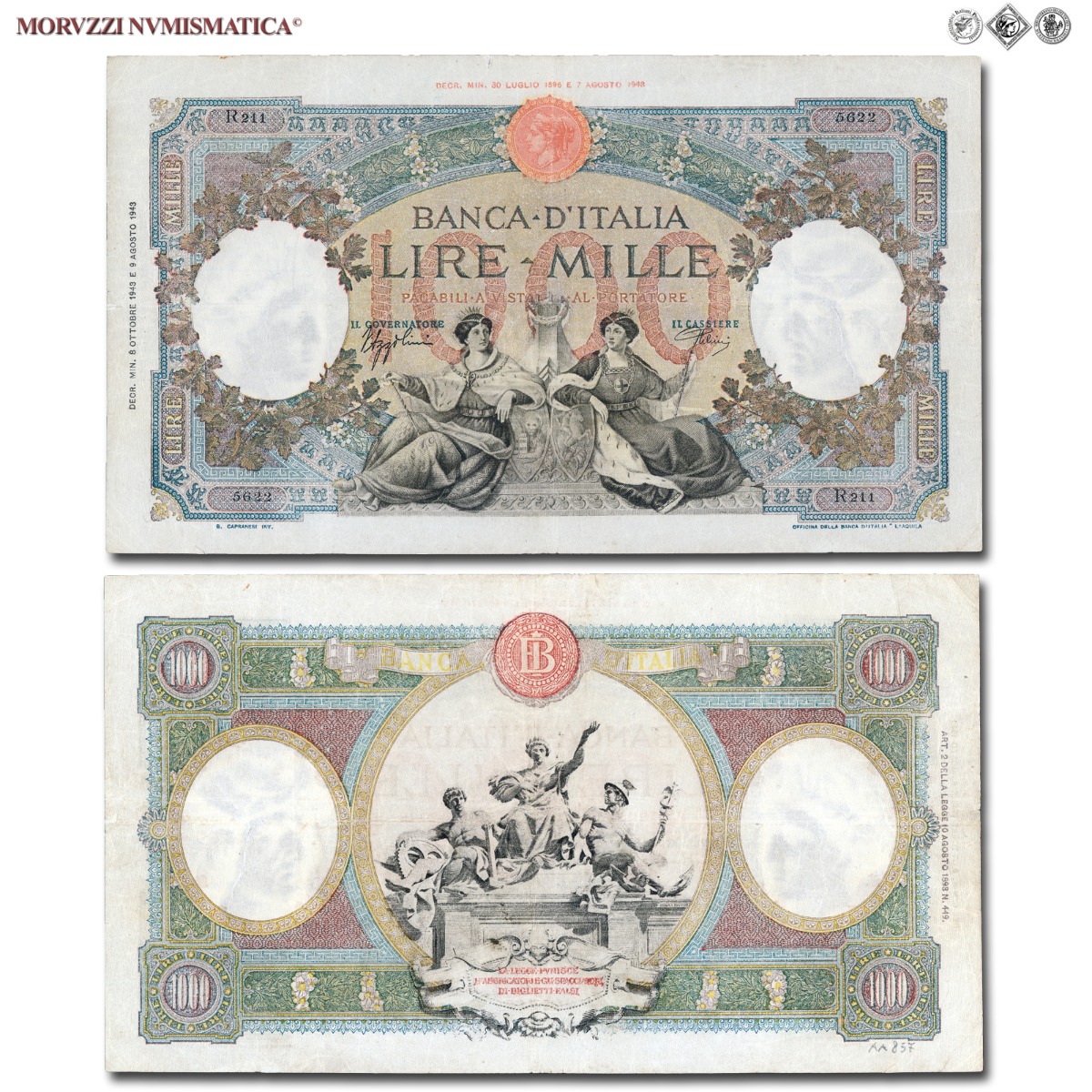 Italia, Repubblica Sociale Italiana, BANCA D'ITALIA, 1000 LIRE, Capranesi - Repubbliche Marinare, 08.10.1943, D/ nel centro due maestose figure femminili sedute, impugnanti il bastone del comando e poggianti sugli stemmi delle città marinare che rappresentano: Venezia e Genova; nei contorni motivi floreali, R/ nel medaglione centrale, riproduzione del gruppo scultoreo un tempo ornante la facciata di Palazzo Kock, sede della Banca d'Italia in Roma, raffigurante le allegorie dell'Agricoltura, Industria e Commercio, Rif. bibl. Unif., 679/R3; Crapanzano, 434/R2; (CM87910), Firme: Azzolini, Urbini, n° di serie: R211 5622, mBB, (RR)