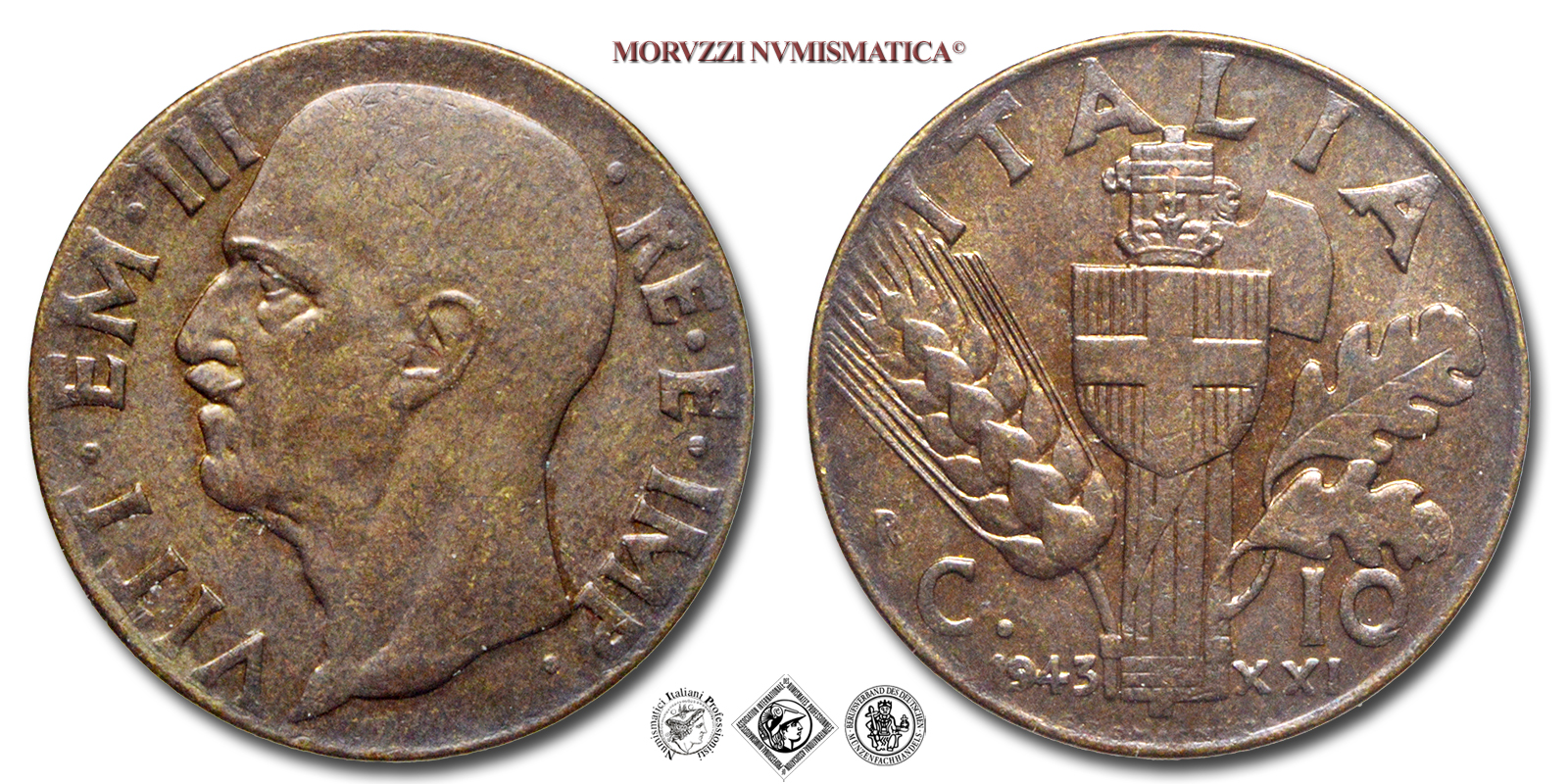 Regno d'Italia, VITTORIO EMANUELE III, 1900-1943, CENTESIMI 10, Impero, Emissione: 1943 XXI, D/ VITT • EM • III • RE • E • IMP •, testa nuda del Re a sinistra, R/ Stemma sabaudo con corona reale sovrapposto ad un fascio. A destra una foglia di quercia a sinistra una spiga di grano. Ai lati della base del fascio millesimo (1943) e anno dell'Era Fascista (XXI); sopra l'indicazione del valore (C. 10). In alto lungo il bordo la scritta ITALIA, a ore 4 l'indicazione dell'autore (G. ROMAGNOLI) e a ore 8 il segno di zecca (R), Zecca di Roma, Rif. bibl. Pagani, 891; Metallo: BA, gr. 4,80, (MI121674), Diam.: mm. 22,52, qFDC