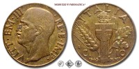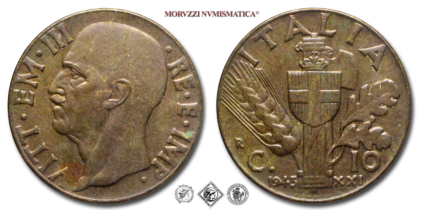 Regno d'Italia, VITTORIO EMANUELE III, 1900-1943, CENTESIMI 10, Impero, Emissione: 1943 XXI, D/ VITT • EM • III • RE • E • IMP •, testa nuda del Re a sinistra, R/ Stemma sabaudo con corona reale sovrapposto ad un fascio. A destra una foglia di quercia a sinistra una spiga di grano. Ai lati della base del fascio millesimo (1943) e anno dell'Era Fascista (XXI); sopra l'indicazione del valore (C. 10). In alto lungo il bordo la scritta ITALIA, a ore 4 l'indicazione dell'autore (G. ROMAGNOLI) e a ore 8 il segno di zecca (R), Zecca di Roma, Rif. bibl. Pagani, 891; Metallo: BA, gr. 4,83, (MI121675), Diam.: mm. 22,53, qFDC