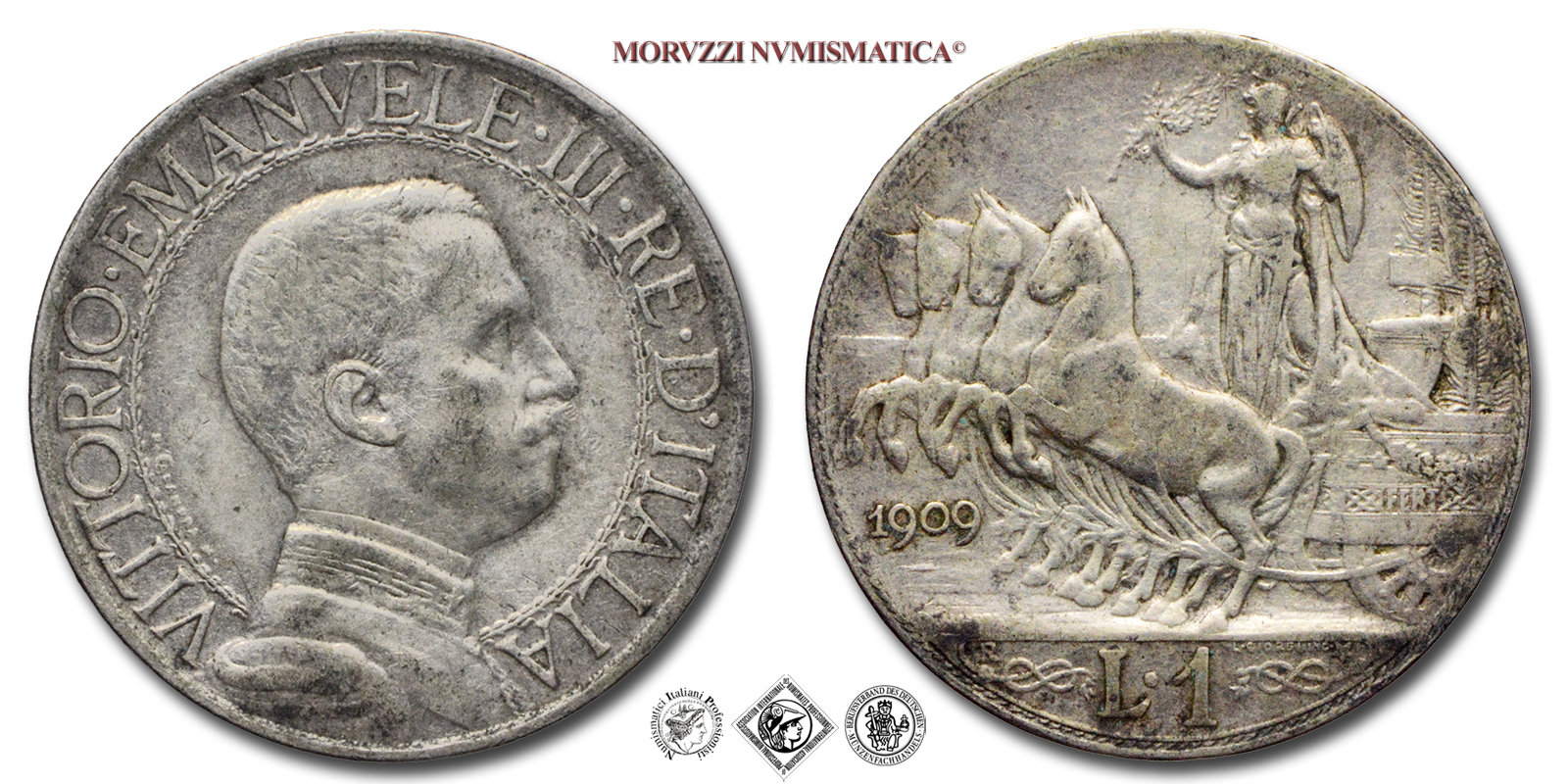 Regno d'Italia, VITTORIO EMANUELE III, 1900-1943, LIRA, Quadriga veloce, Emissione: 1909, D/ semibusto in uniforme del Re volto a destra, contornato da: VITTORIO • EMANUELE • III • RE • D'ITALIA cerchiato. A ore otto fra il colletto dell'uniforme e il cerchio interno il nome dell'autore D • CALANDRA M •, R/ figura allegorica dell'Italia con scudo, elmo e ramo di quercia posta su di un carro trainato da quattro cavalli. Il carro è adornato di nodi savoia. Sotto le zampe dei cavalli l'indicazione del millesimo (1909). In esergo il valore (L • 1) tra due nodi savoia, sopra il nodo di sinistra il segno di zecca (R), sopra il nodo di destra il nome dell'incisore: D • GIORGI INC. e una stella a cinque punte. A ore sette sulla linea dell'esergo: D • CALANDRA M •, Zecca di Roma, Rif. bibl. Pagani, 769; Metallo: AR, gr. 4,94, (MI150464), Diam.: mm. 23,16, qBB