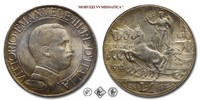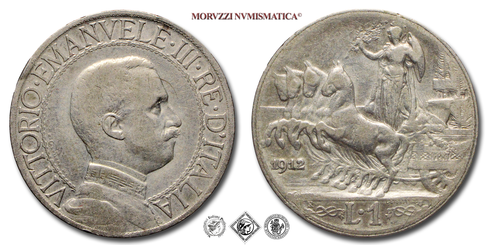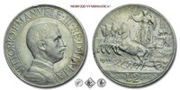 Regno d'Italia, VITTORIO EMANUELE III, 1900-1943, LIRA, Quadriga veloce, Emissione: 1912, D/ semibusto in uniforme del Re volto a destra, contornato da: VITTORIO • EMANUELE • III • RE • D'ITALIA cerchiato. A ore 8 fra il colletto dell'uniforme e il cerchio interno il nome dell'autore D • CALANDRA M •, R/ figura allegorica dell'Italia con scudo, elmo e ramo di quercia posta su di un carro trainato da quattro cavalli. Il carro è adornato di nodi savoia. Sotto le zampe dei cavalli l'indicazione del millesimo (1912). In esergo il valore (L • 1) tra due nodi savoia, sopra il nodo di sinistra il segno di zecca (R), sopra il nodo di destra il nome dell'incisore: D • GIORGI INC. e una stella a cinque punte. A ore sette sulla linea dell'esergo: D • CALANDRA M •, Zecca di Roma, Rif. bibl. Pagani, 771; Metallo: AR, gr. 4,92, (MI150465), Diam.: mm. 23,07, BB