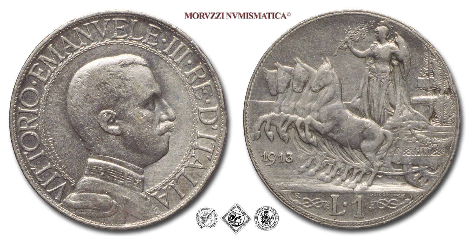 Regno d'Italia, VITTORIO EMANUELE III, 1900-1943, LIRA, Quadriga veloce, Emissione: 1913, D/ semibusto in uniforme del Re volto a destra, contornato da: VITTORIO • EMANUELE • III • RE • D'ITALIA cerchiato. A ore 8 fra il colletto dell'uniforme e il cerchio interno il nome dell'autore D • CALANDRA M •, R/ figura allegorica dell'Italia con scudo, elmo e ramo di quercia posta su di un carro trainato da quattro cavalli. Il carro è adornato di nodi savoia. Sotto le zampe dei cavalli l'indicazione del millesimo (1913). In esergo il valore (L • 1) tra due nodi savoia, sopra il nodo di sinistra il segno di zecca (R), sopra il nodo di destra il nome dell'incisore: D • GIORGI INC. e una stella a cinque punte. A ore sette sulla linea dell'esergo: D • CALANDRA M •, Zecca di Roma, Rif. bibl. Pagani, 772; Metallo: AR, gr. 4,99, (MI150463), Diam.: mm. 23,14, mBB