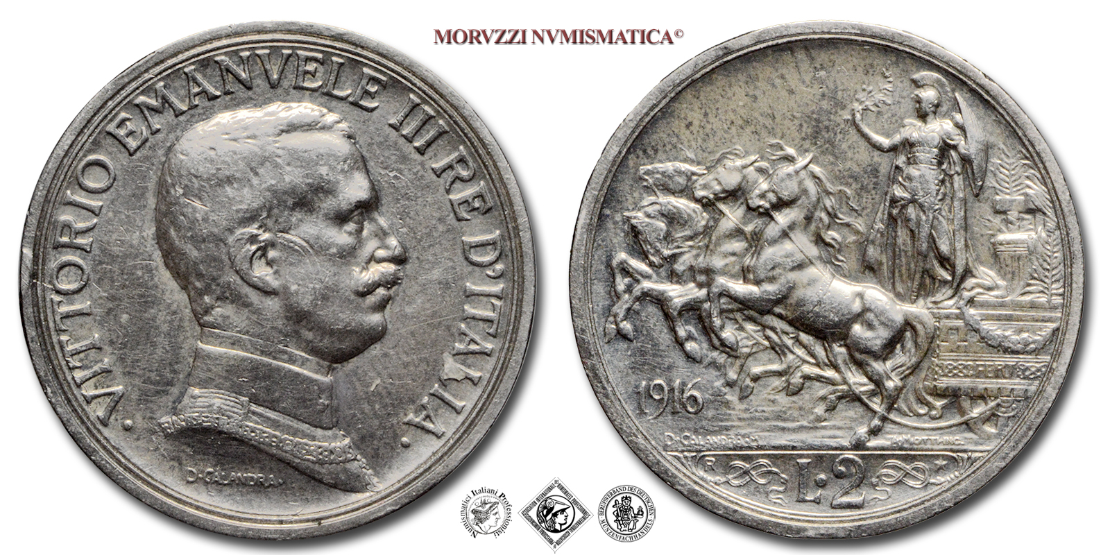 Regno d'Italia, VITTORIO EMANUELE III, 1900-12943, LIRE 2, Quadriga briosa, Emissione: 1916, D/ • VITTORIO • EMANUELE • III • RE • D'ITALIA •, busto in uniforme e con il collare dell'Annunziata del Re a d.; sotto: indicazione del nome dell'autore (D • CALANDRA •), R/ figura allegorica dell'Italia con scudo, elmo e ramo di quercia posta su di un carro trainato da quattro cavalli. Il carro è adorno di festoni, di nodi savoia e presenta il motto FERT; sotto le zampe anteriori dei cavalli: indicazione del millesimo (1916) ; in esergo: indicazione del nominale (L • 2) tra due nodi savoia; sopra il nodo di s.: il segno di zecca (R); sopra il nodo di d.: una stella a cinque punte; sulla linea dell'esergo: a s. il nome dell'autore (D • CALANDRA • M), a d. il nome dell'incisore (A • MOTTI INC •), Zecca di Roma, Rif. bibl. Pagani, 739; Metallo: AR, gr. 9,97, (MI150536), Diam.: mm. 27,12, mBB