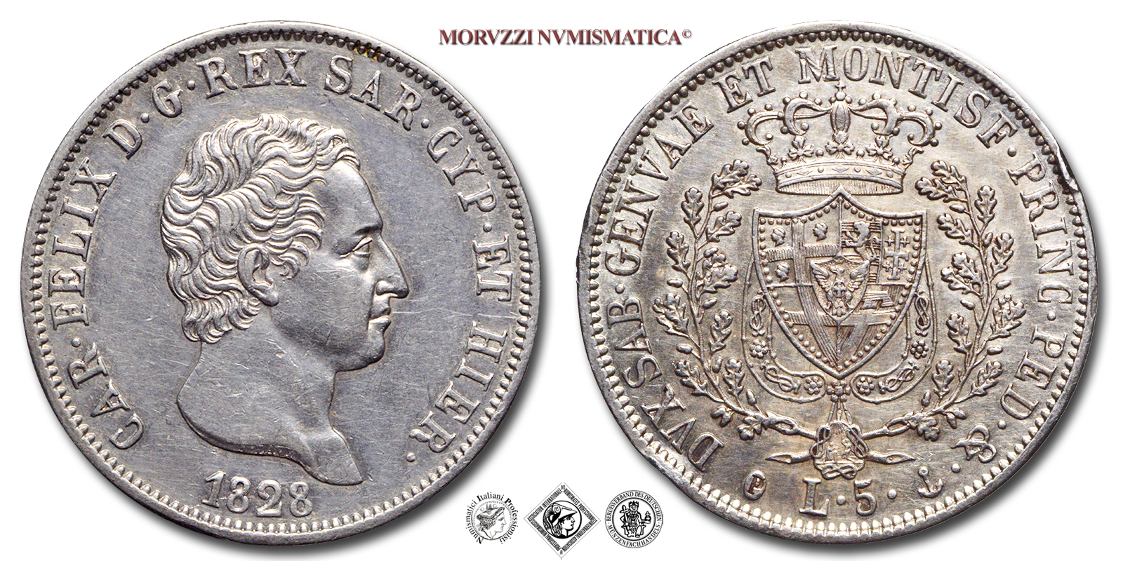 Regno di Sardegna, CARLO FELICE, LIRE 5 (SCUDO), 1828, Zecca di Genova, ARGENTO, SPL, (Pagani 74) / monete italiane preunitarie moderne (moneta italiana preunitaria moderna - scudi d'argento da collezione - Casa Savoia)