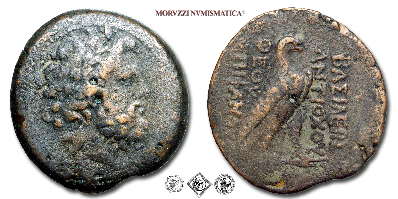 Regno Seleucide, ANTIOCO IV, Epifane, 175-164 a.C., BRONZO, Emissione: 175-164 a.C., D/ testa laureata di Zeus Serapide a d., R/ BASILEWS / ANTIOXOY / QEOY / EPIFANOYS, aquila stante a d. su fulmine, Rif. bibl. Sear, 6985; B.M.C., 42; Metallo: AE, gr. 37,81, (MG149973), Diam.: mm. 36,20, MB