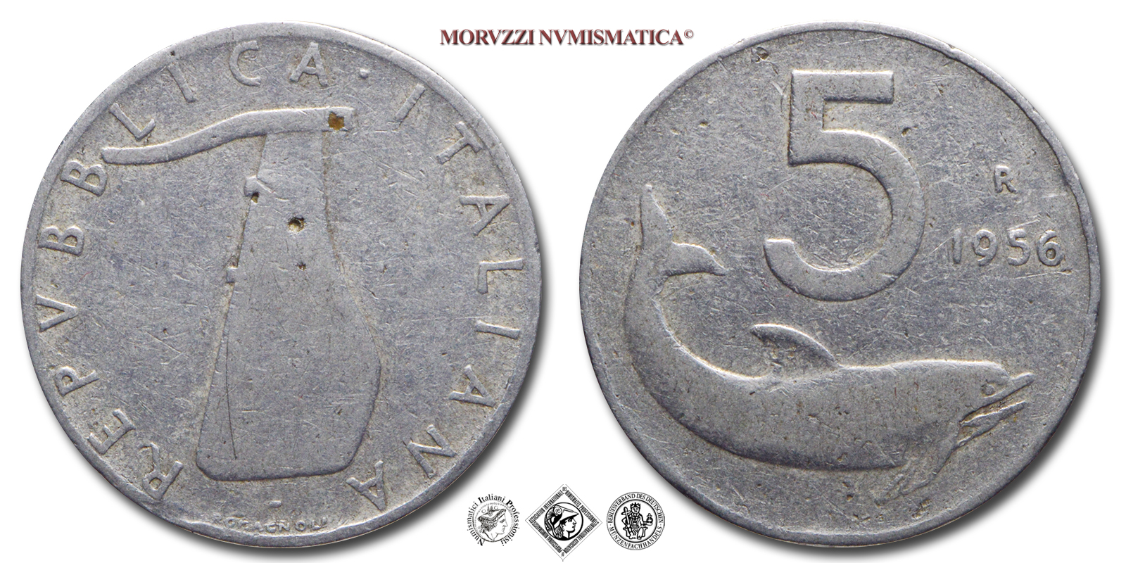 Repubblica Italiana, LIRE 5, Delfino, 1956, Zecca di Roma, ITALMA, MB, (R), (Pagani 2361) / monete italiane moderne rare (moneta italiana moderna rara da collezione)