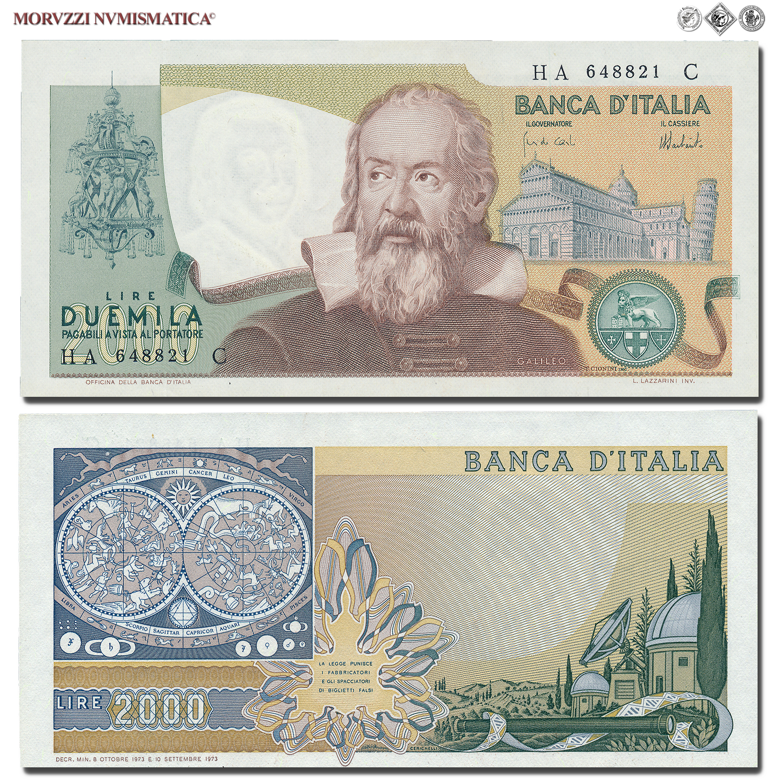 Italia, Repubblica, BANCA D'ITALIA, 2000 LIRE, Galileo Galilei, 08.10.1973, D/ Al centro del biglietto busto di Galileo Galilei, ripreso da un ritratto di Justus Sustermans, conservato nella Galleria degli Uffizi di Firenze. A destra, sullo sfondo, veduta della Cattedrale Metropolitana Primaziale di Santa Maria Assunta con relativo Campanile (la celebre Torre pendente di Pisa), R/ Sulla sinistra raffigurazione dei segni zodiacali, come rappresentati su un'incisione del XVII secolo. A destra veduta dell'osservatorio di Arcetri, Rif. bibl. Crapanzano, 502; Unif., 740; (CM11188), Firme: Carli, Barbarito, n° di serie: HA 648821 C, mSPL