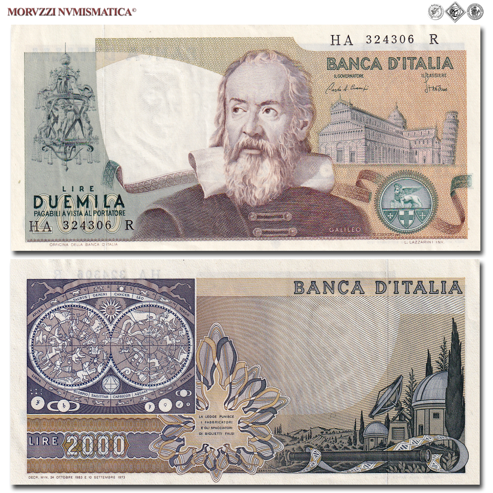 Italia, Repubblica, BANCA D'ITALIA, LIRE 2000, Galileo Galilei, 24.10.1983, D/ al centro busto di Galileo Galilei, ripreso da un ritratto di Justus Sustermans, conservato nella Galleria degli Uffizi di Firenze. A destra, sullo sfondo, veduta della Cattedrale Metropolitana Primaziale di Santa Maria Assunta con relativo Campanile (la celebre Torre pendente di Pisa), R/ sulla sinistra raffigurazione dei segni zodiacali, come rappresentati su un'incisione del XVII secolo. A destra veduta dell'osservatorio di Arcetri, Rif. bibl. Crapanzano, 504; (CM154433), Firme: Ciampi, Stevani, di serie: HA 324306 R, qFDS