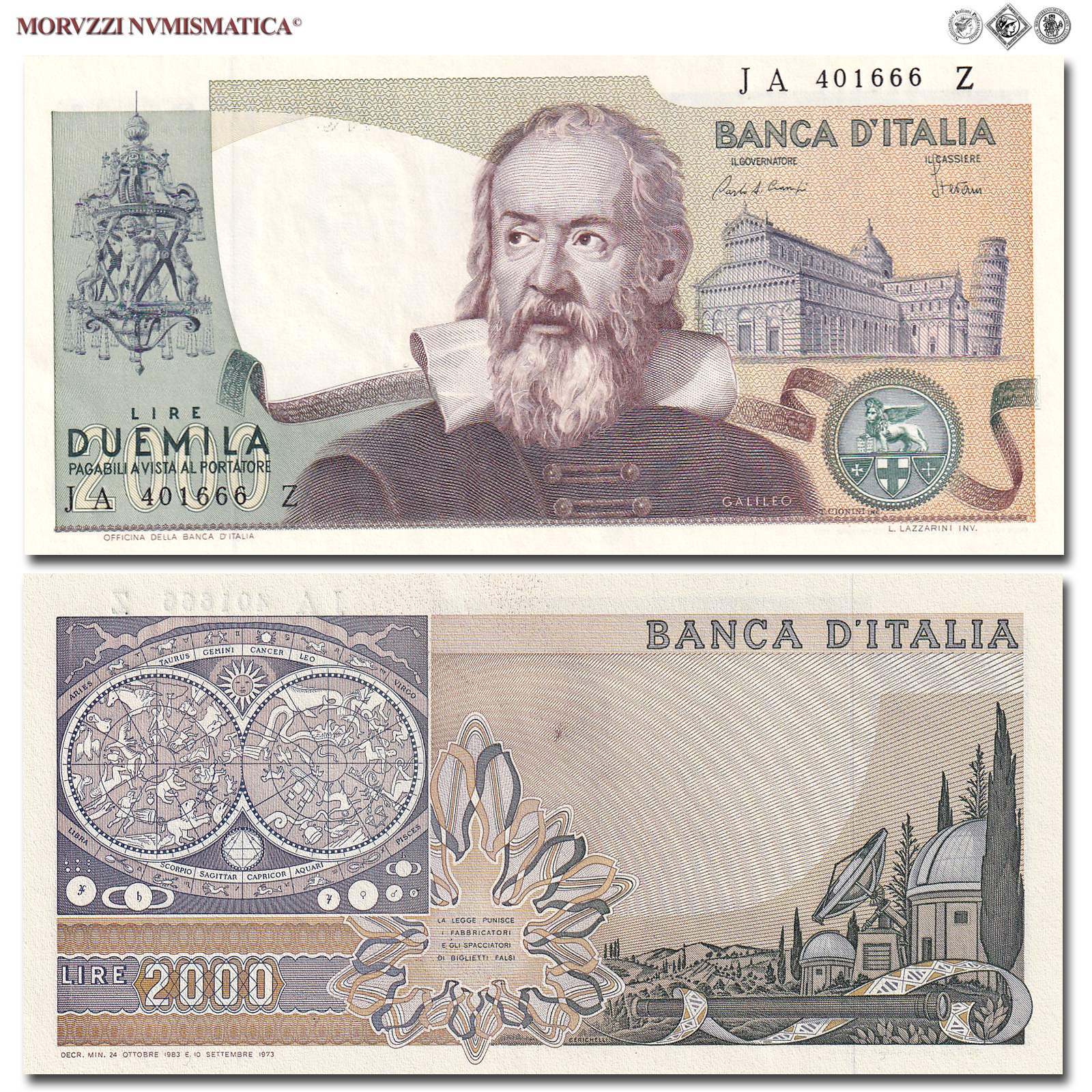 Italia, Repubblica, BANCA D'ITALIA, LIRE 2000, Galileo Galilei, 24.10.1983, D/ al centro busto di Galileo Galilei, ripreso da un ritratto di Justus Sustermans, conservato nella Galleria degli Uffizi di Firenze. A destra, sullo sfondo, veduta della Cattedrale Metropolitana Primaziale di Santa Maria Assunta con relativo Campanile (la celebre Torre pendente di Pisa), R/ sulla sinistra raffigurazione dei segni zodiacali, come rappresentati su un'incisione del XVII secolo. A destra veduta dell'osservatorio di Arcetri, Rif. bibl. Crapanzano, 504; (CM154431), Firme: Ciampi, Stevani, di serie: JA 401666 Z, FDS