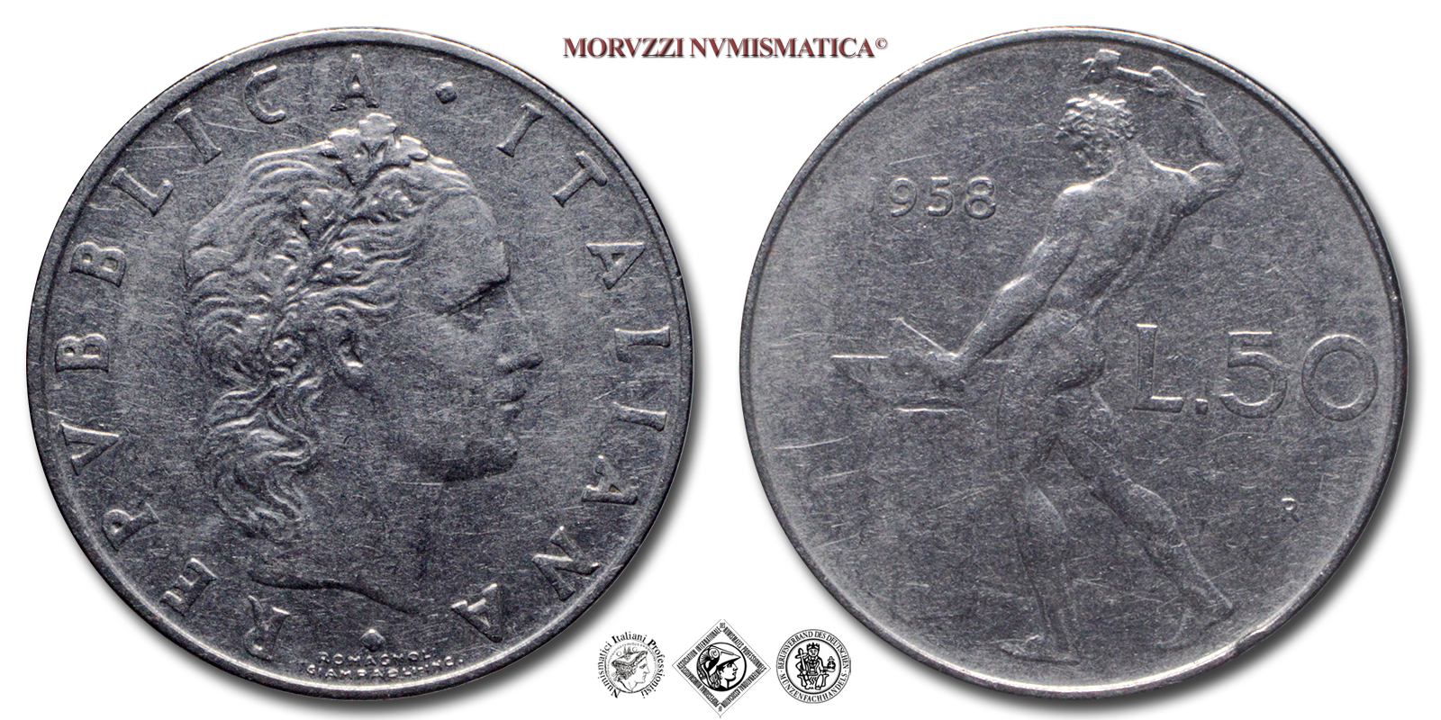 Italia, REPUBBLICA, Dal 1946, LIRE 50, Vulcano - I tipo, Emissione: 1958, D/ Testa di donna con corona di foglie di quercia volta a destra, intorno REPVBBLICA • ITALIANA. Sotto lungo il bordo un rombo e l'indicazione degli autori (ROMAGNOLI • GIAMPAOLI INC •) su tre righe, R/ Rappresentazione del Dio Vulcano che batte il ferro su di una incudine. A destra il valore (L. 50) con sotto il segno di zecca (R), a sinistra a ore 10 il millesimo (1958), Zecca di Roma, Rif. bibl. Pagani, 2205; Metallo: AC, gr. 6,28, (MI97415), Diam.: mm. 24,83, BB, (R)