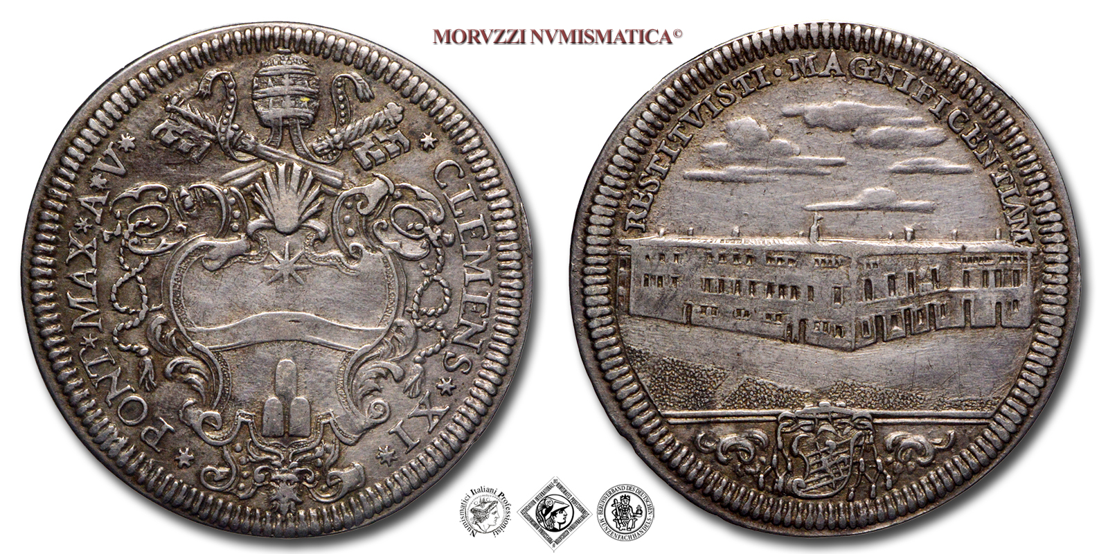 Stato Pontificio, CLEMENTE XI, Albani, TESTONE, A V, RESTITVISTI • MAGNIFICENTIAM veduta del Palazzo Ducale di Urbino; in esergo: armetta D'Aste, Zecca di Roma, ARGENTO, SPL, (RRR), (Muntoni 80) / monete papali rare (moneta papale pontificia rara da collezione - piastre pontificie d'argento)