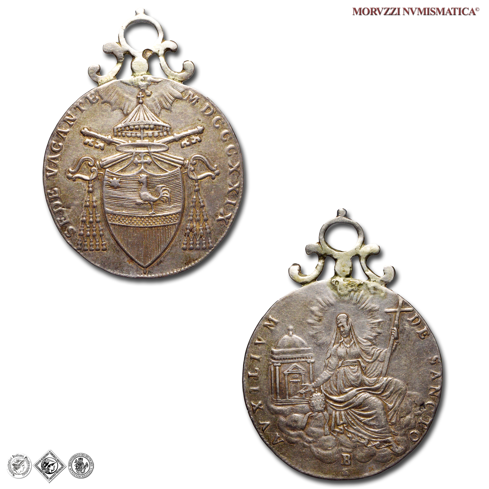 Stato Pontificio, SEDE VACANTE, 1829, SCUDO, Esemplare con appiccagnolo, Emissione: 1829, D/ SEDE VACANTE - MDCCCXXIX, stemma, in alto colomba raggiante, R/ AVXILIVM - DE SANCTO. Sotto, il segno di zecca (B) e GC (in monogramma), la Chiesa, con testa radiata, seduta sulle nubi e reggente la croce; a sinistra tempietto, Zecca di Bologna, Rif. bibl. Pagani, 122; Davenport, 188; Metallo: AR, gr. 27,80, (MX146947), Diam.: mm. 40,05, BB, (NC)