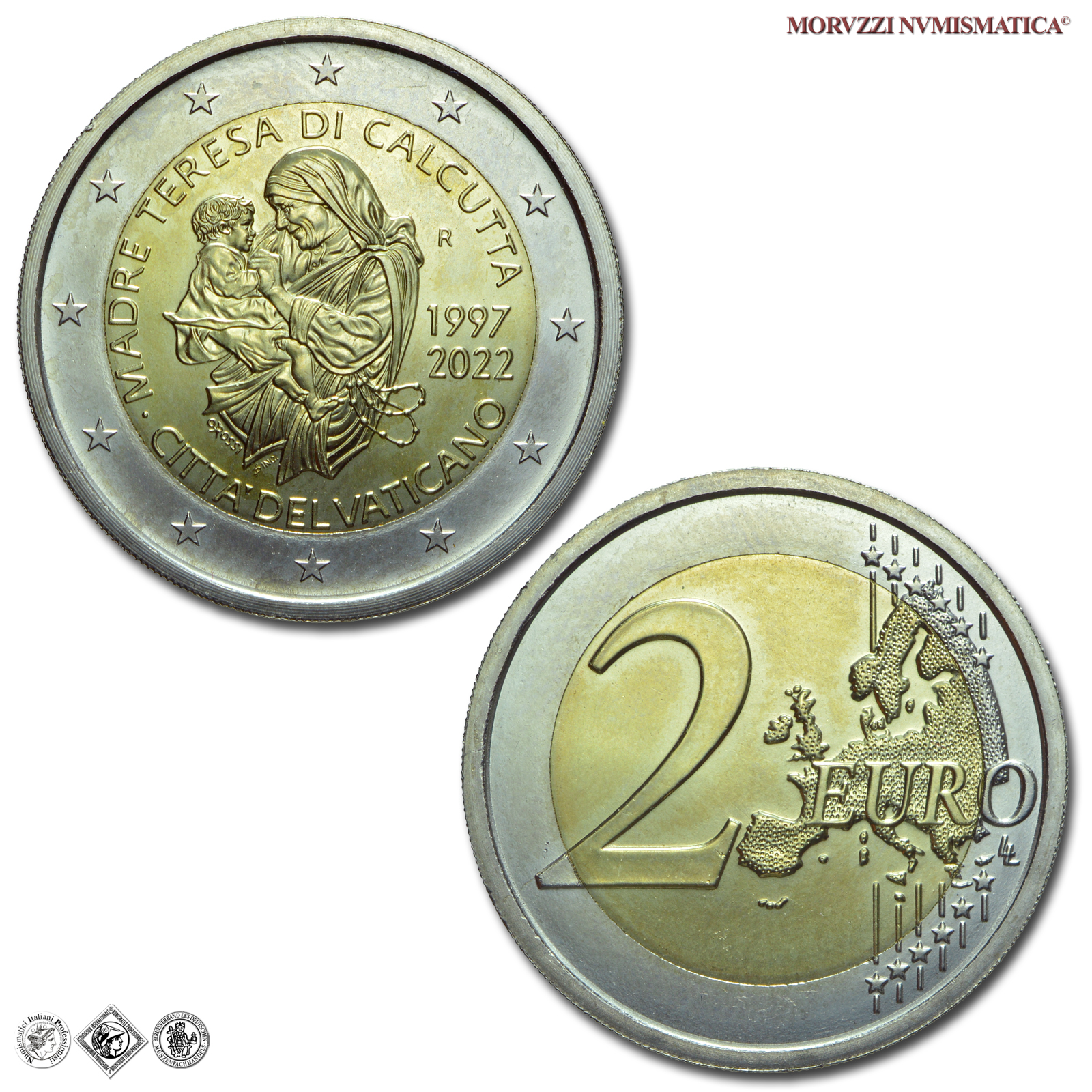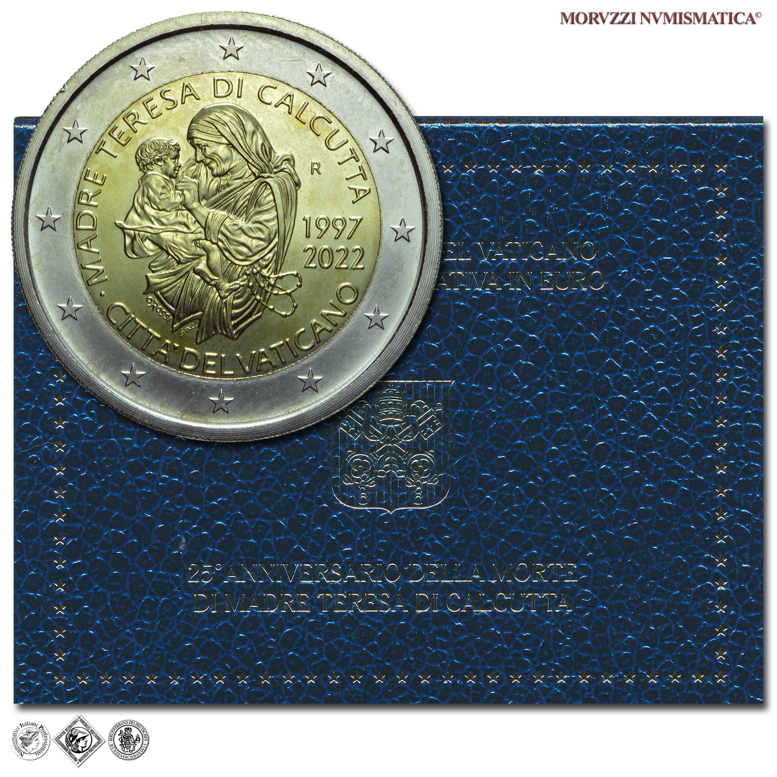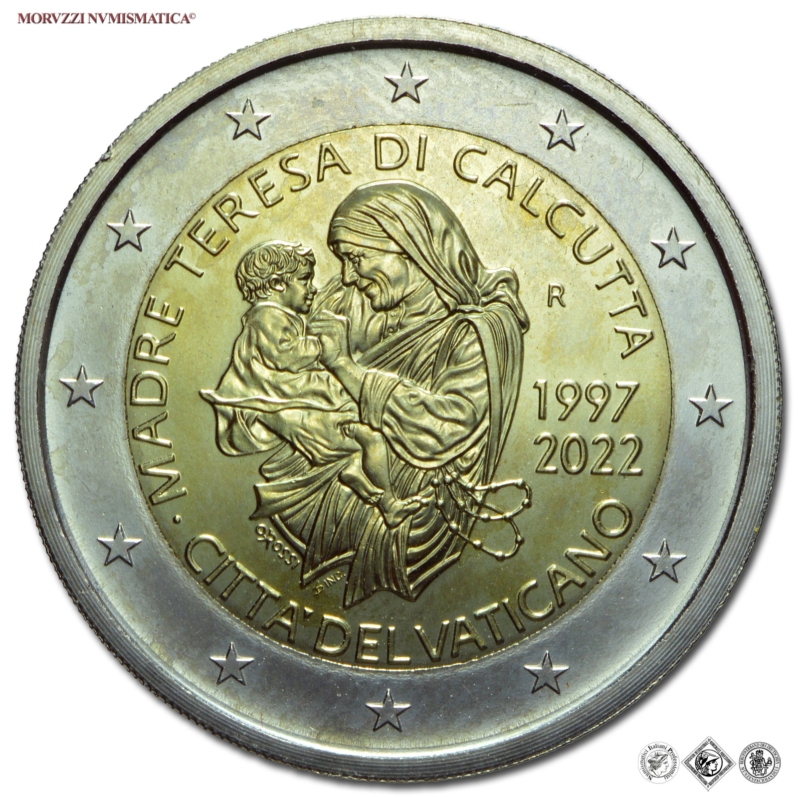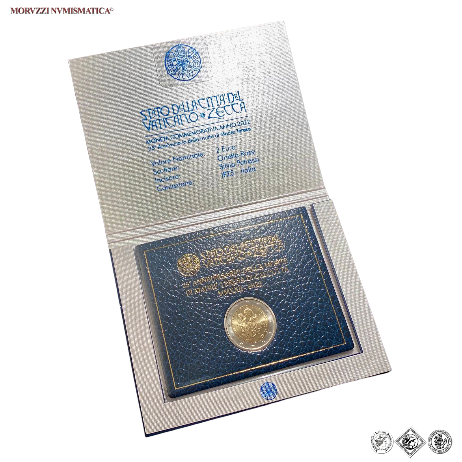 Città del Vaticano, FRANCESCO, Bergoglio, 2 euro commemorativo 2022, Moneta bimetallica da due euro commemorativa del 25° Anniversario della morte di Madre Teresa di Calcutta, D/ Madre Teresa stringe tra le braccia un bimbo indiano, guardandolo con espressione materna, R/ 2 EURO, mappa dell'Unione Europea e le 12 stelle dei paesi fondatori della moneta unica; LL nella parte esterna, nella confezione originale della zecca di Roma, Metallo: CU/NI, gr. 8,50, Diam.: mm 25,75, FDC