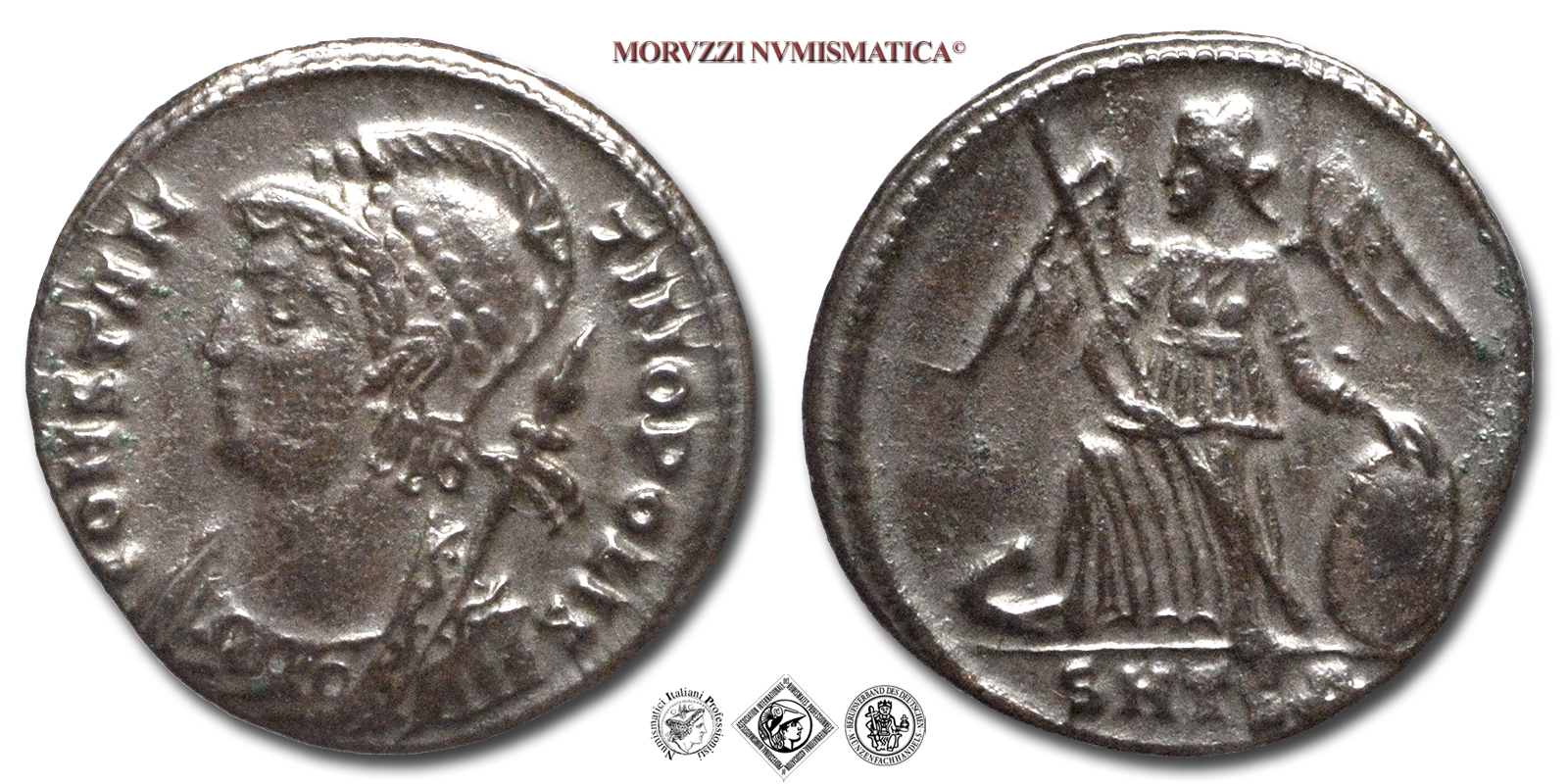 Impero Romano, EMISSIONE COMMEMORATIVA, PICCOLO BRONZO, Emissione: 330-333 d.C., D/ CONSTANTINOPOLIS, busto galeato a sinistra con scettro nella destra, R/ SMTSDA, la Vittoria stante su prora a sinistra con lancia nella destra e scudo nella sinistra, Zecca di Tessalonica, Rif. bibl. R.I.C., 188; Cohen, 21; Metallo: AE, gr. 2,38, (MR160286), Diam.: mm. 17,83, SPL