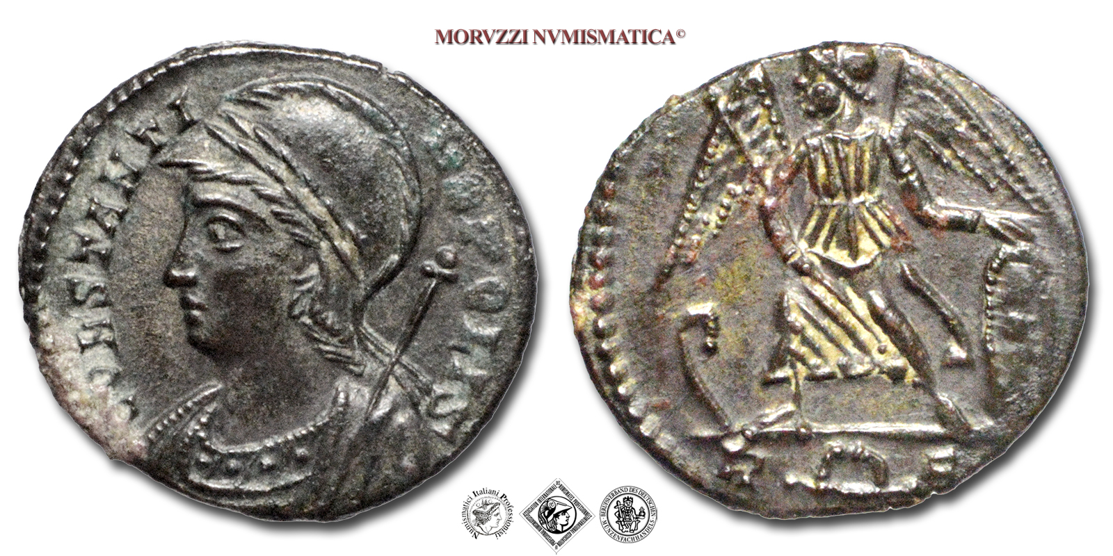 Impero Romano, EMISSIONE COMMEMORATIVA, PICCOLO BRONZO, Emissione: 333-335 d.C., D/ CONSTANTINOPOLIS, busto galeato e laureato di Costantinopoli a sinistra con scettro, R/ la Vittoria alata su prua di nave a sinistra con lancia nella destra si appoggia con la sinistra allo scudo; in esergo: R #e#, Zecca di Roma, Rif. bibl. R.I.C., 355/S; Cohen, 21; Metallo: AE, gr. 2,09, (MR160387), Diam.: mm. 17,60, SPL, (R)
