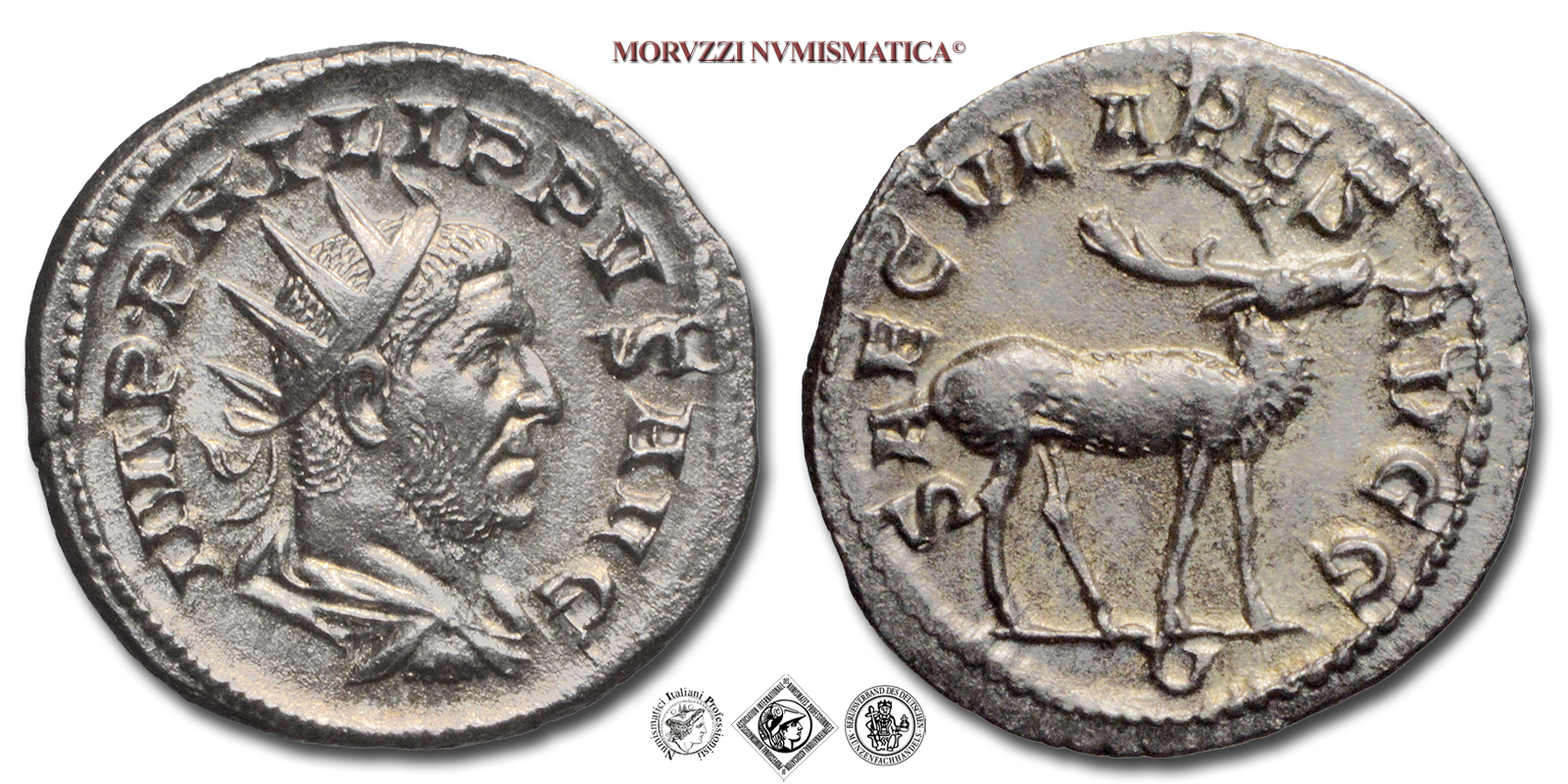 Impero Romano, FILIPPO I, 244-249 d.C., ANTONINIANO, Emissione: 248 d.C., D/ IMP PHILIPPVS AVG, busto radiato con paludamento e corazza a d., R/ SAECVLARES AVGG / U, cervo andante a d., Zecca di Roma, Rif. bibl. R.I.C., 19; Cohen, 182; Metallo: AR, gr. 3,51, (MR162453), Diam.: mm. 21,92, SPL, (R)