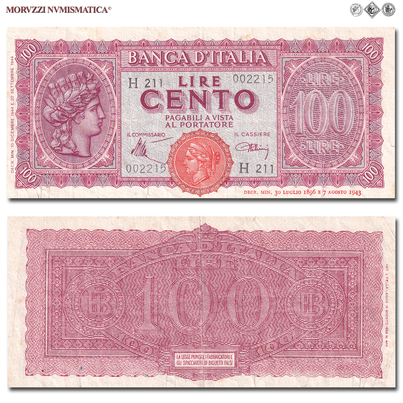 Italia, Luogotenenza, BANCA D'ITALIA, LIRE 100, Italia turrita, 10.12.1944, D/ nell'ovale sinistro testa dell'Italia turrita con stella; in quello destro "Lire 100", R/ cifra "100" tra due monogrammi "B.I.", Rif. bibl. Crapanzano, 260C; (CM123456), Firme: Introna, Urbini, di serie: H211 002215, BB