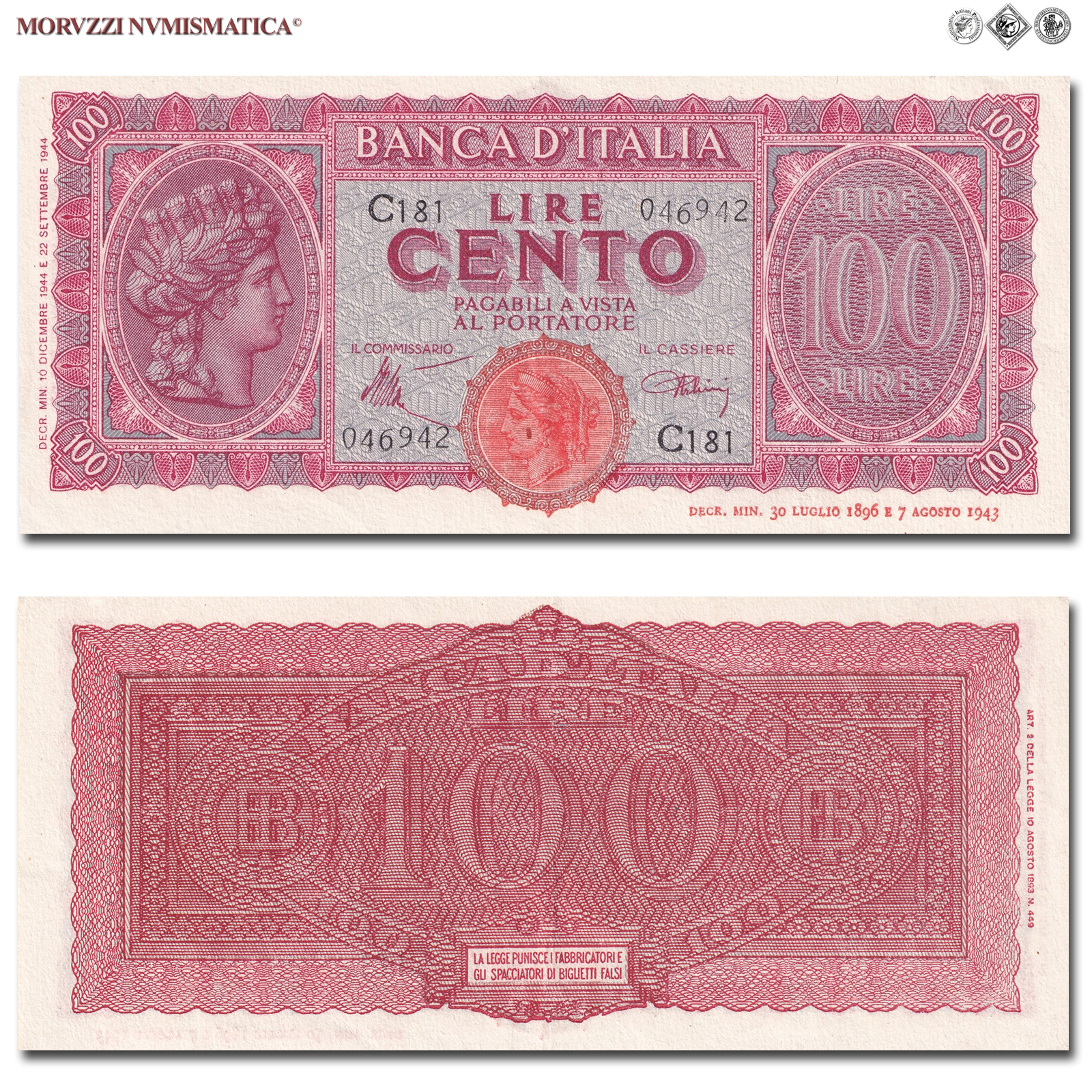 Italia, Luogotenenza, BANCA D'ITALIA, LIRE 100, Italia turrita, 10.12.1944, D/ nell'ovale sinistro testa dell'Italia turitta con stella; in quello destro "Lire 100", R/ cifra "100" tra due monogrammi "B.I.", Rif. bibl. Crapanzano, 260B; (CM92553), Firme: Introna, Urbini, di serie: C181 046942, mSPL