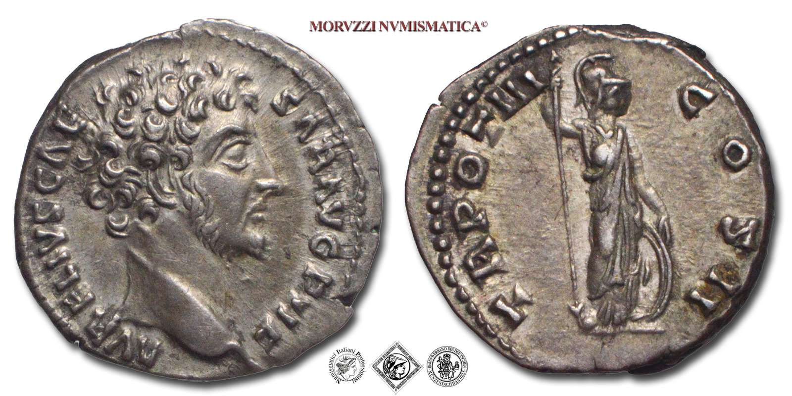 Impero Romano, MARCO AURELIO, Cesare, 161-180 d.C., DENARIO, Emissione: 148-149 d.C., D/ AVRELIVS CAESAR AVG PII, testa nuda a destra, R/ TR POT III COS II, Minerva galeata stante a destra con lancia nella destra poggia la sinistra sullo scudo a terra, Zecca di Roma, Rif. bibl. Rif. bibl. Rif. bibl. R.I.C., 444; Cohen, 618; Metallo: AR, gr. 3,41, (MR162452), Diam.: mm. 18,11, SPL