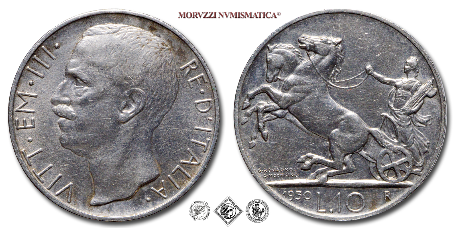 Regno d'Italia, VITTORIO EMANUELE III, 1900-1943, LIRE 10, Biga, Emissione: 1930, D/ VITT • EM • III • RE • D'ITALIA •, testa nuda del Re a sinistra, R/ figura allegorica dell'Italia volta a s., su biga, nella mano sinistra stringe un fascio littorio e con la destra le redini; Sotto ai cavalli i nomi dell'incisore (MOTTI INC •) e dell'autore (G • ROMAGNOLI). In esergo il valore (L • 10) tra la data (1930) e il segno di zecca (R), Zecca di Roma, Rif. bibl. Pagani, 695; Metallo: AR, gr. 9,97, (MI159601), Diam.: mm. 27,14, mBB, (R)