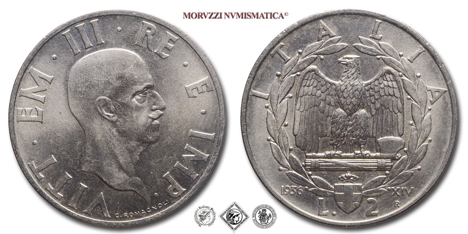 Regno d'Italia, VITTORIO EMANUELE III, 1900-1943, LIRE 2, Impero, Emissione: 1936 XIV, D/ VITTORIO • EMANUELE • III • RE • E • IMP •, testa nuda del Re a s.; in basso, lungo il bordo: G • ROMAGNOLI, R/ aquila con ali spiegate e fascio tra gli artigli; intorno: corona di alloro e la scritta ITALIA; in basso: stemma sabaudo tra il valore (L • 2) con a d. la data fascista (XIV) e il segno di zecca (R) e a s. il millesimo (1936), Zecca di Roma, Rif. bibl. Pagani, 754; Metallo: AC, gr. 9,85, (MI159101), Diam.: mm. 29,00, SPL, (R)