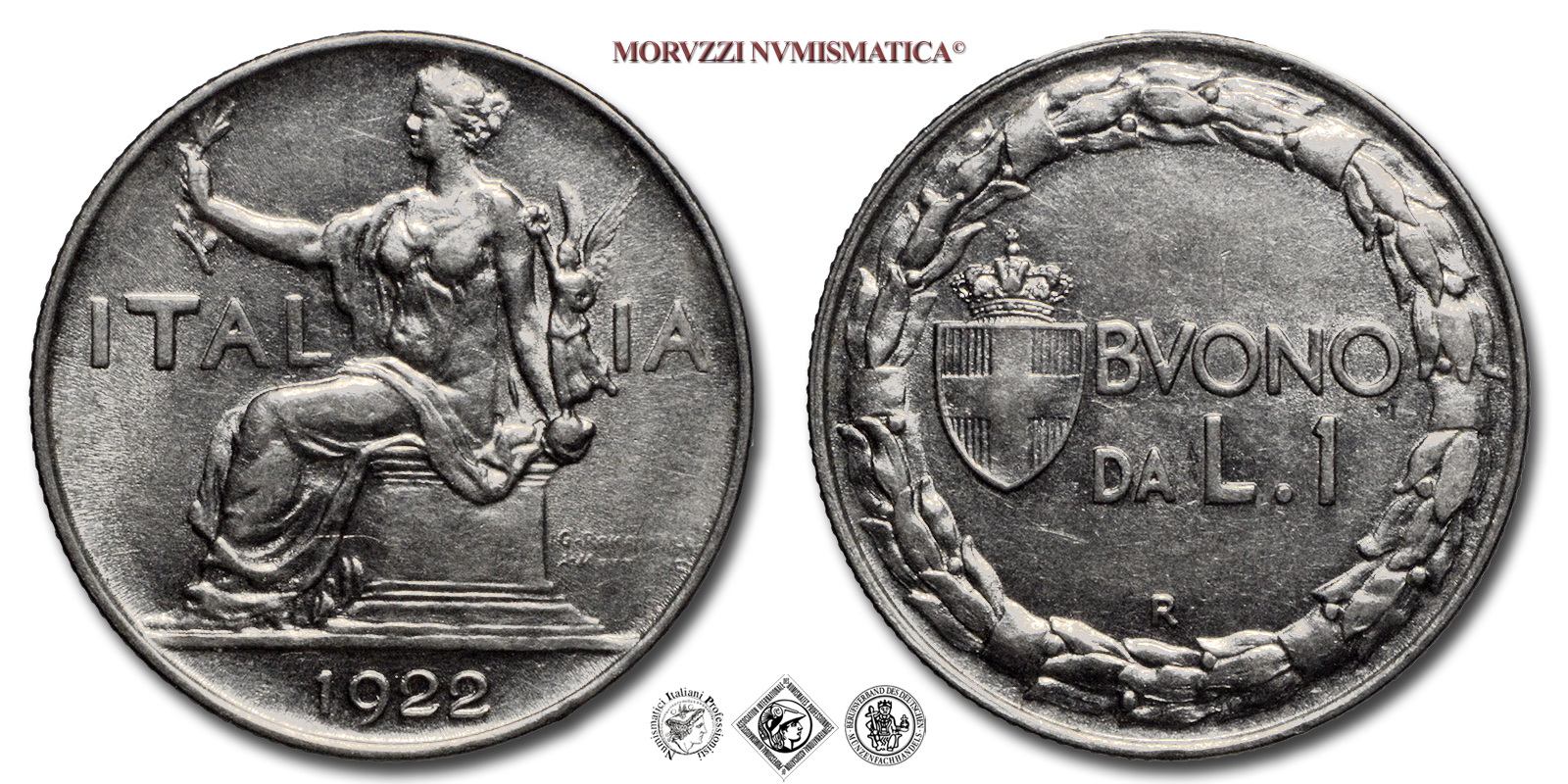 Regno d'Italia, VITTORIO EMANUELE III, 1900-1943, BUONO DA 1 LIRA, Italia seduta, Emissione: 1922, D/ Figura allegorica simboleggiante l'Italia seduta su di un piedistallo e volta verso sinistra che regge con la destra un ramoscello di ulivo e con la sinistra una Vittoria alata. Sullo sfondo in orizzontale la scritta ITALIA. A destra del piedistallo i nomi degli autori G • ROMAGNOLI e A • MOTTI INC • su due righe. In esergo il millesimo (1922), R/ Indicazione del valore (BUONO DA L • 1) su due righe affiancata dallo stemma Sabaudo con corona Reale. Lungo il bordo corona di alloro posta in senso orario, Zecca di Roma, Rif. bibl. Pagani, 776; Metallo: NI, gr. 8,05, (MI126649), Diam.: mm. 26,83, FDC