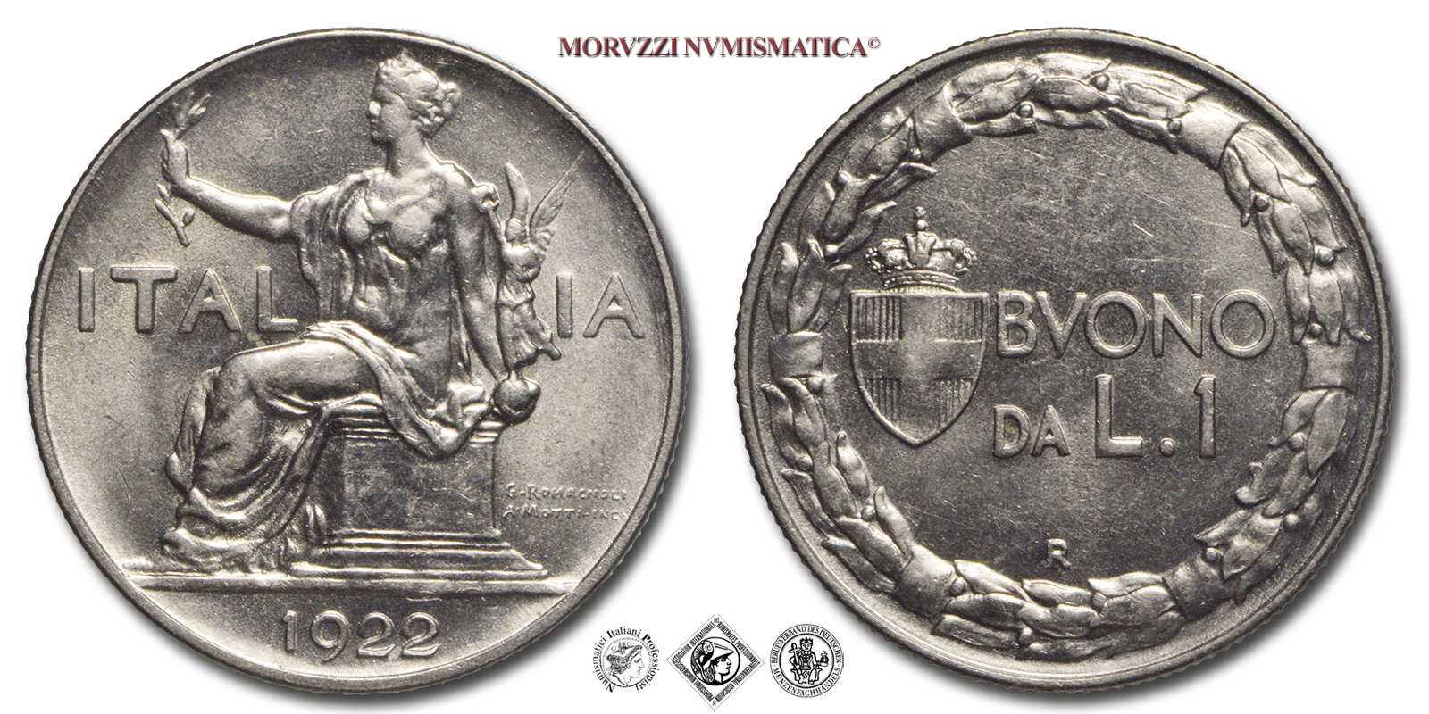 Regno d'Italia, VITTORIO EMANUELE III, BUONO DA 1 LIRA, Italia seduta, 1922, Zecca di Roma, NICHEL, FDC, (Pagani 776) / monete italiane moderne (moneta italiana moderna da collezione - Casa Savoia)