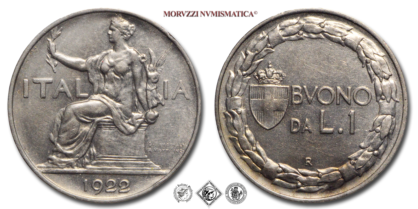 Regno d'Italia, VITTORIO EMANUELE III, 1900-1943, BUONO DA 1 LIRA, Italia seduta, Emissione: 1922, D/ Figura allegorica simboleggiante l'Italia seduta su di un piedistallo e volta verso sinistra che regge con la destra un ramoscello di ulivo e con la sinistra una Vittoria alata. Sullo sfondo in orizzontale la scritta ITALIA. A destra del piedistallo i nomi degli autori G • ROMAGNOLI e A • MOTTI INC • su due righe. In esergo il millesimo (1922), R/ Indicazione del valore (BUONO DA L • 1) su due righe affiancata dallo stemma Sabaudo con corona Reale. Lungo il bordo corona di alloro posta in senso orario, Zecca di Roma, Rif. bibl. Pagani, 776; Metallo: NI, gr. 8,00, (MI126655), Diam.: mm. 26,56, mSPL