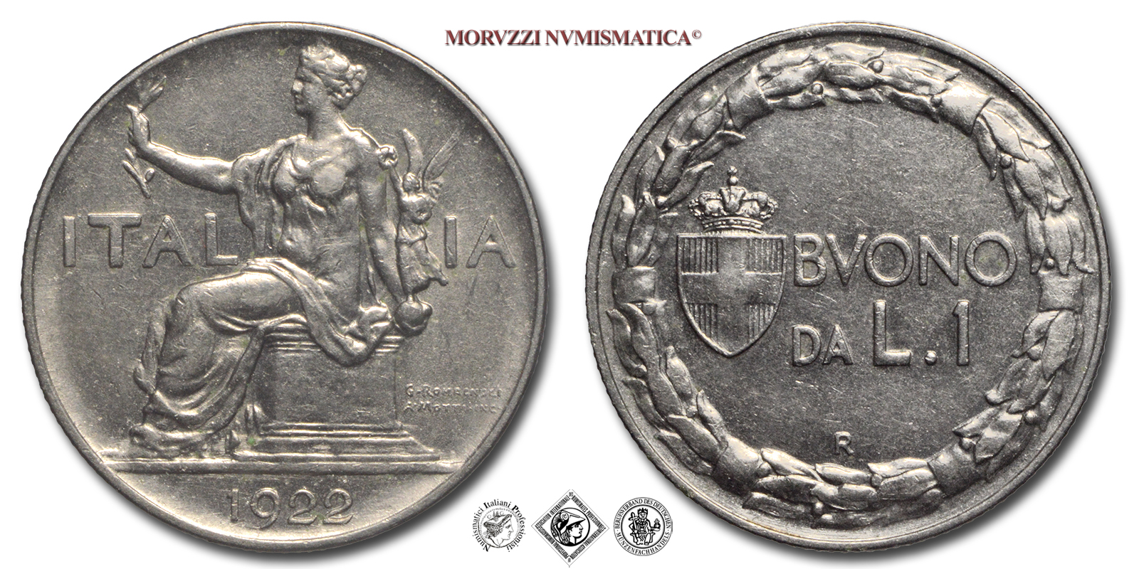 Regno d'Italia, VITTORIO EMANUELE III, BUONO DA 1 LIRA, Italia seduta, 1922, Zecca di Roma, NICHEL, mSPL, (Pagani 776) / monete italiane moderne (moneta italiana moderna da collezione - Casa Savoia)