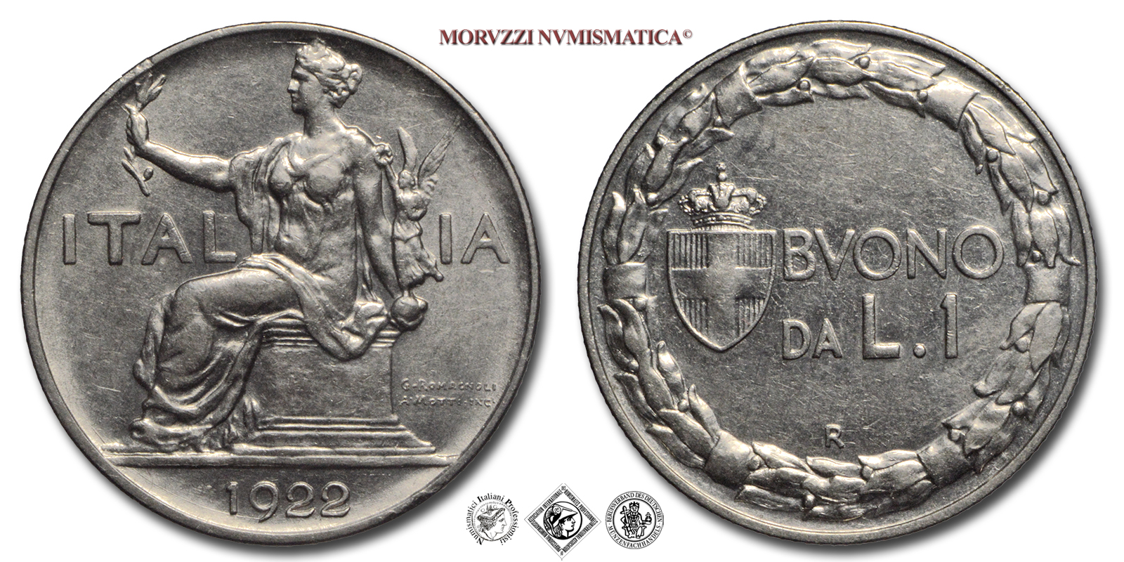 Regno d'Italia, VITTORIO EMANUELE III, 1900-1943, BUONO DA 1 LIRA, Italia seduta, Emissione: 1922, D/ Figura allegorica simboleggiante l'Italia seduta su di un piedistallo e volta verso sinistra che regge con la destra un ramoscello di ulivo e con la sinistra una Vittoria alata. Sullo sfondo in orizzontale la scritta ITALIA. A destra del piedistallo i nomi degli autori G • ROMAGNOLI e A • MOTTI INC • su due righe. In esergo il millesimo (1922), R/ Indicazione del valore (BUONO DA L • 1) su due righe affiancata dallo stemma Sabaudo con corona Reale. Lungo il bordo corona di alloro posta in senso orario, Zecca di Roma, Rif. bibl. Pagani, 776; Metallo: NI, gr. 8,08, (MI126666), Diam.: mm. 26,68, qFDC